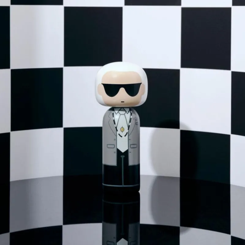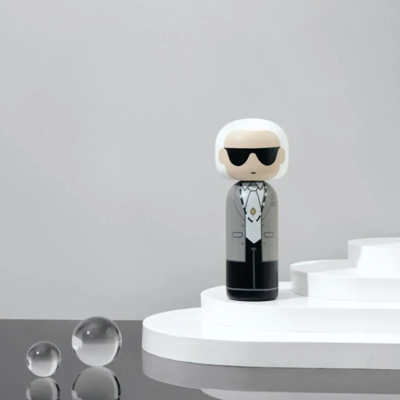 Seit Mitte der 1950er Jahre regierte Karl Lagerfeld die Pariser Modewelt wie kein anderer Designer zuvor. Das zuvor angeschlagene Modehaus Chanel machte er in den 80er Jahren zum internationalen Milliardenkonzern, indem er seinen stilbildenden Einfluss als Modeschöpfer, Designer und Fotograf geltend machte. Zu seinen Markenzeichen gehörte ein weiß gepuderter Zopf, dunkle Sonnenbrillen und ein hochstehender, weißer Vatermörder-Kragen. In der Limited Edition trägt er ein graues Jackett, von dieser Variante werden nur 1000 Stück gefertigt. Die Kokeshi-Holzfigur aus handbemaltem Holz ist 16,5 cm hoch. Kleine Unregelmäßigkeiten sind typisch für die Bemalung per Hand und machen jede Puppe zu einem Unikat.