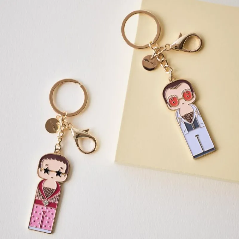 Sänger, Komponist, Pianist, Oscar-Preisträger: der Engländer Elton John gehört mit 300 Millionen Tonträgern zu den erfolgreichsten Musikkünstlern der Welt. Zu seinen Markenzeichen gehören extravagante Bühnenoutfits und Brillen. Das weiße, federbesetzte Outfit trug Elton 1974 bei einem Fotoshooting in seinem Haus. Der Schlüsselanhänger aus einer Zinklegierung gefertigt und ist 6 cm hoch.