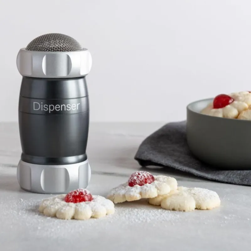 Der Dispenser von Marcato ist perfekt geeignet, um selbst hergestellten Nudel- oder Keksteig zu bestäuben. Er verteilt gleichmäßig Mehl oder Hartweizengriße auf frischen Nudeln, so sind sie leichter zu verarbeiten. Auch auf andere Backwaren werden Puderzucker, Kakaopulver und weitere Aromen zuverlässig und perfekt dosierbar verteilt. Der funktionale Dispenser liegt nicht nur gut in der Hand, er hat auch ein ansprechendes Design. Der Korpus ist aus einer eloxierten Aluminiumlegierung hergestellt, die Verschlussringe sind aus Chromstahl und das Sieb besteht aus Edelstahl. Der Dispenser hat einen Durchmesser von 6 cm und ist 12,5 cm hoch.