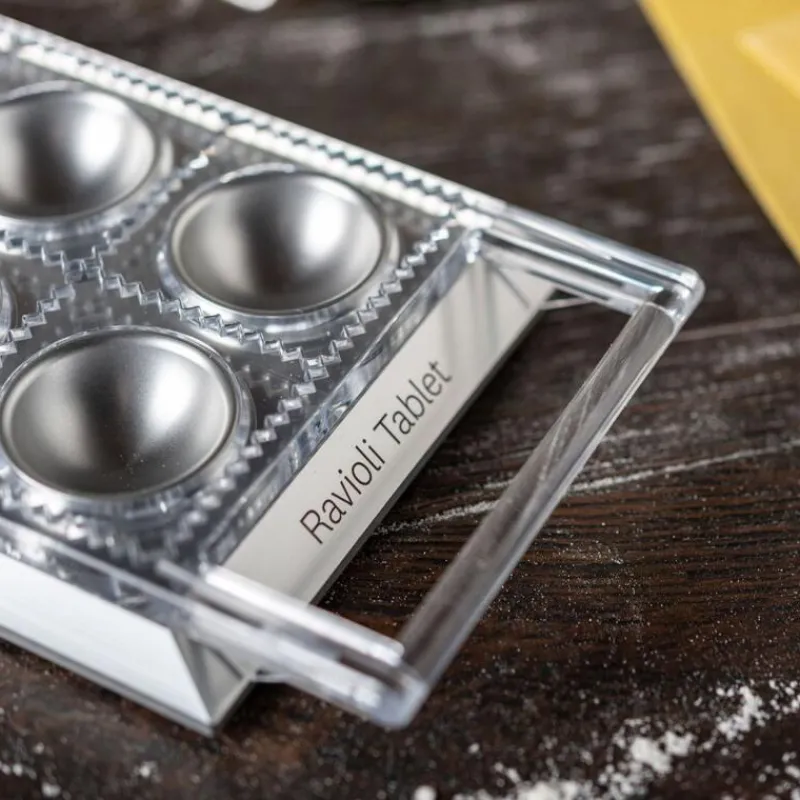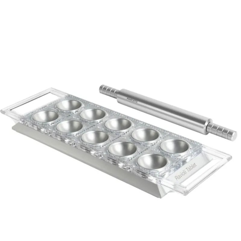 Leckere Ravioli im Handumdrehen zaubert das praktische Tablett aus eloxiertem Aluminium. Die entfernbare Schneidfefläche besteht aus transparentem Polycarbonat und gewährleistet einen sauberen und präzisen Schnitt. Mithilfe des Tabletts lassen sich pro Durchgang zehn Ravioli mit den Maßen 5 x 5 cm herstellen, die ganz nach Belieben gefüllt werden können. Im Anschluss lassen sich die Ravioli ganz leicht von der Form ablösen. Im Lieferumfang enthalten ist außerdem ein passendes Nudelholz. Das Raviolitablett ist 33,8 cm lang und 12 cm breit.