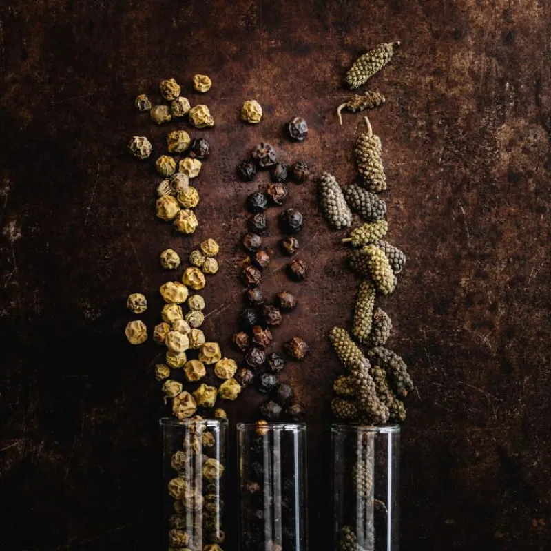 Das Gourmet Pfeffer Set von Microplane besteht aus der Gewürz-Mühle und drei ausgewählten Gewürzen von Pfeffersack & Söhne. Mit der Gewürzmühle lassen sich nicht nur Gewürze wie Muskatnuss, Zimt und Tonkabohnen mühelos reiben, sondern auch im hohlen Deckel aufbewahren. Die Mühle mahlt auch Gewürze wie Pfeffer, Kräuter und Getreidekörner fein und präzise und liefert so hochwertige Ergebnisse und ein vollmundiges Aroma. Ihr praktischer Silikonverschluss vermeidet außerdem Gewürzstaub. Sie lässt sich ganz leicht in der Spülmaschine reinigen. Im Set enthalten sind außerdem 13 g ganzer Schokoladenpfeffer, 6 g ganzer grüner Pfeffer und 16 g ganzer Tellicherry Pfeffer. Schokoladenpfeffer ist nicht nur pikant scharf, sondern bezaubert auch durch ein Aroma, das an geröstete Kakaobohnen erinnert. Grüner Pfeffer ist herrlich frisch und geeignet für alle, die es etwas milder mögen. Der Tellicherry-Pfeffer zeichnet sich durch ein intensives und nussiges Aroma und eine würzige Schärfe aus.