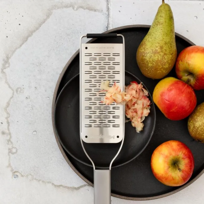 Die neue Professional-Serie von Microplane überzeugt durch konstante Leistung, außergewöhnliche Haltbarkeit und minimalistischer Eleganz. Die Rahmenstruktur sowie das Griffdesign sind entsprechen der Master- bzw. Black Sheep-Kollektion, sind aber hier komplett aus Edelstahl gefertigt. Die matte Verarbeitung des Griffes erzeugt einen klassischen, zeitlosen Look, der in jede moderne Küche passt, während der rutschfeste Gummifuß für die nötige Stabilität beim Reiben sorgt. Die langlebige, rasiermesserscharfe Edelstahlklinge der 2-Wege Schneide von Microplane wird vor Ort in den USA gefertigt, mit der mitgelieferten Schutzhülle ist die Reibe schnell verstaut. Die 2-Wege Schneide aus der Professional-Serie von Microplane kann problemlos in der Spülmaschine gereinigt werden. Sie ist ideal für das Reiben von größeren Mengen, da sie das Reiben in zwei Richtungen erlaubt.