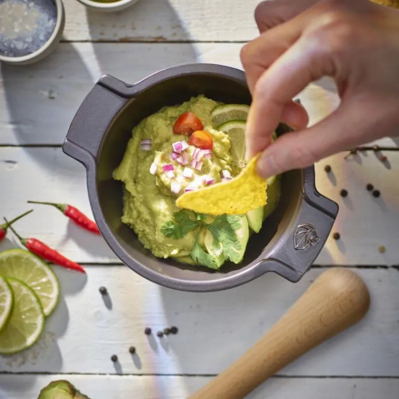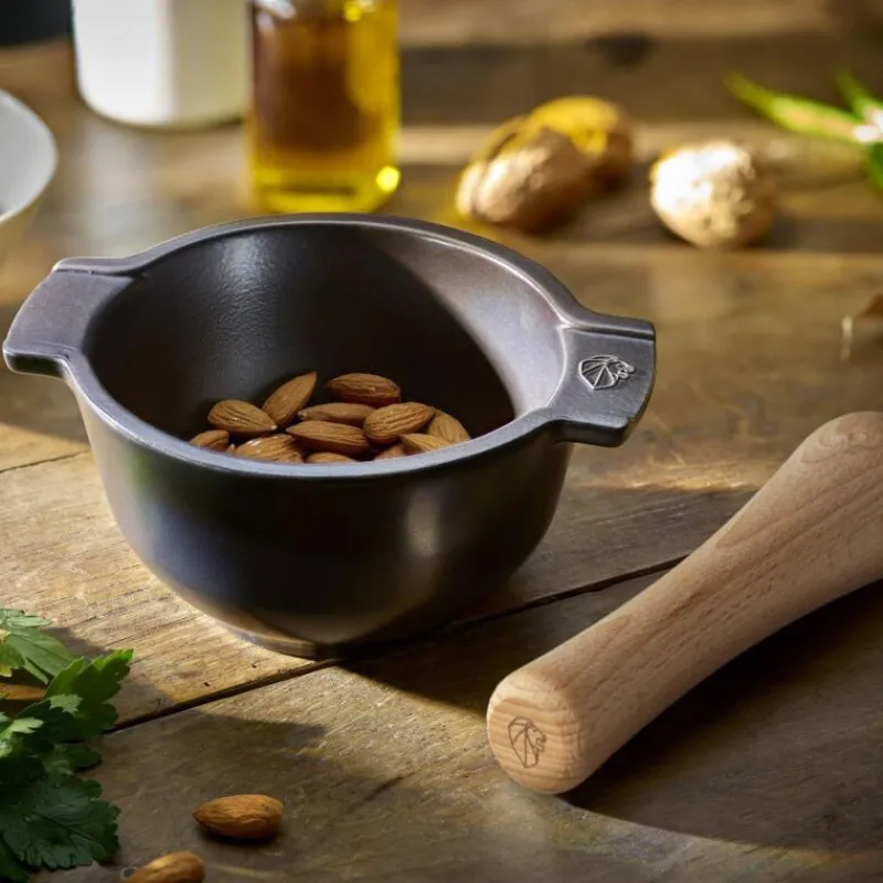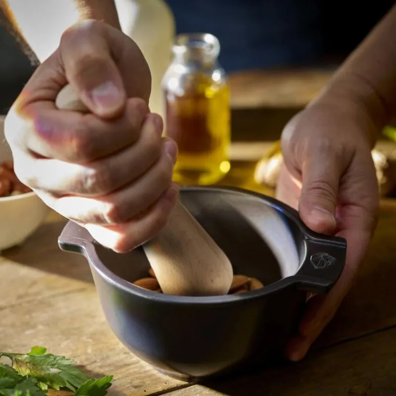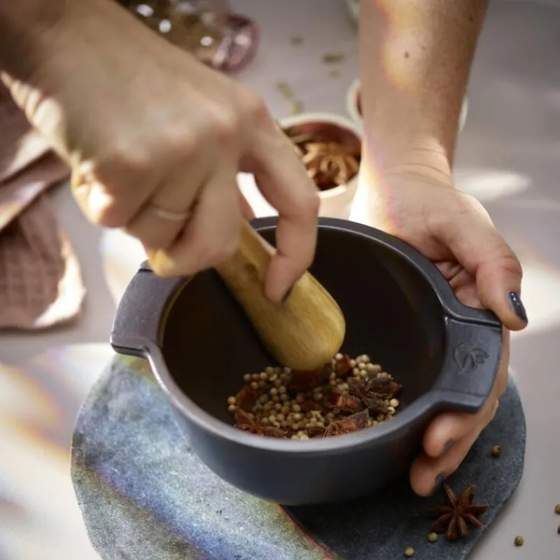 Das Zerkleinern von Gewürzen, Trockenfrüchten sowie das Zubereiten von Kräutermischungen, Saucen oder Marinaden wird mit dem Appolia Mörser zum Kinderspiel. Er wird in der firmeneigenen Keramik-Manufaktur in Frankreich aus Materialien natürlichen Ursprungs hergestellt, aufgrund dieses Materials ist er robust und leichter als gusseiserne Mörser. Dank der seitlichen Griffe ist er zudem leicht festzuhalten. Aufgrund seiner rauen Innenglasur haften Zutaten nicht an und der Mörser ist flecken- und geruchsresistent. Der passende Stößel aus Buchenholz zerkleinert Zutaten zuverlässig und effektiv. Der Appolia Mörser ist inklusive der Griffe 16,8 cm breit, 7,6 cm hoch und kann in der Spülmaschine gereinigt werden.