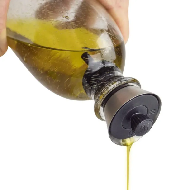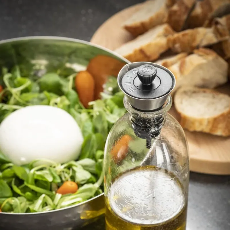 Der Ciro Ausgießer von Peugeot passt praktischerweise in die Öffnungen der meisten Essig- oder Ölflaschen und sorgt mit vier präzisen Einstellungsmöglichkeiten für eine optimale Durchflussmenge von Öl und Essig: wählbar sind die Optionen komplett geschlossen, tropfenweise, mittlerer Fluss oder kontinuierlicher Fluss. So kann die Menge des Öls je nach Rezept reguliert werden , ein Tropschutzsystem garantiert dabei ein fleckenloses Ausgießen und hält Tisch und Arbeitsfläche sauber. Der Ciro Ausgießer besteht aus Edelstahl und Kunststoff und ist 9 cm lang. Er kann ganz einfach in der Spülmaschine gereinigt werden.