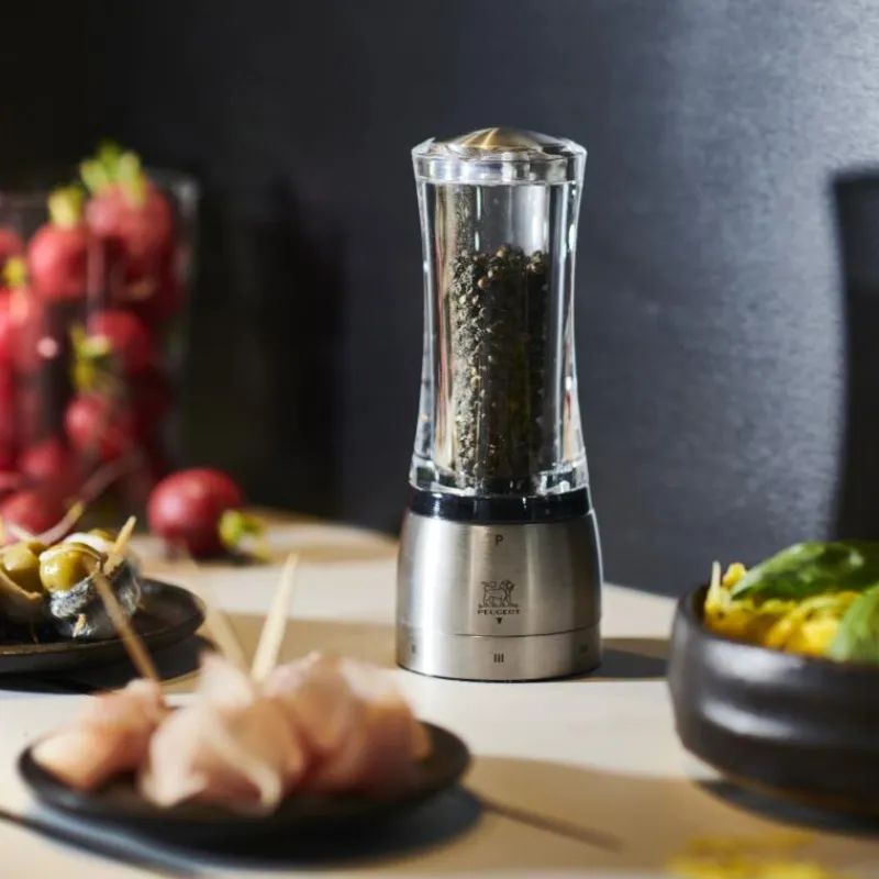 Das Design der Mühle Daman von Peugeot ist das perfekte Zusammenspiel aus formschönem Design und praktischer Zweckmäßigkeit. Dabei treffen die beiden Werkstoffe Acryl und Edelstahl in einem eleganten Zusammenspiel aufeinander, was zu einem interessanten Designeffekt führt. Ein weiterer Vorteil des Entwurfes ist der Verzicht auf eine Mittelachse, was das Befüllen der Mühle über den magnetischen Verschluss an ihrer Oberseite erleichtert. Zudem ist die Mühle Daman mit einem präzisen Einstellsystem für den Mahlgrad ausgestattet, das sich unten an der Mühle befindet. Wählbar sind sechs Voreinstellungen von sehr fein bis extra grob, diese schneiden den Pfeffer in Scheiben anstatt ihn zu zerdrücken und entfalten so das volle Aroma. Insgesamt ist die Mühle 16 cm hoch.