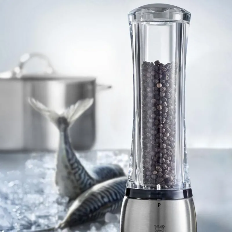 Das Design der Mühle Daman von Peugeot ist das perfekte Zusammenspiel aus formschönem Design und praktischer Zweckmäßigkeit. Dabei treffen die beiden Werkstoffe Acryl und Edelstahl in einem eleganten Zusammenspiel aufeinander, was zu einem interessanten Designeffekt führt. Ein weiterer Vorteil des Entwurfes ist der Verzicht auf eine Mittelachse, was das Befüllen der Mühle über den magnetischen Verschluss an ihrer Oberseite erleichtert. Zudem ist die Mühle Daman mit einem präzisen Einstellsystem für den Mahlgrad ausgestattet, das sich unten an der Mühle befindet. Wählbar sind sechs Voreinstellungen von sehr fein bis extra grob, diese schneiden den Pfeffer in Scheiben anstatt ihn zu zerdrücken und entfalten so das volle Aroma. Insgesamt ist die Mühle 21 cm hoch.