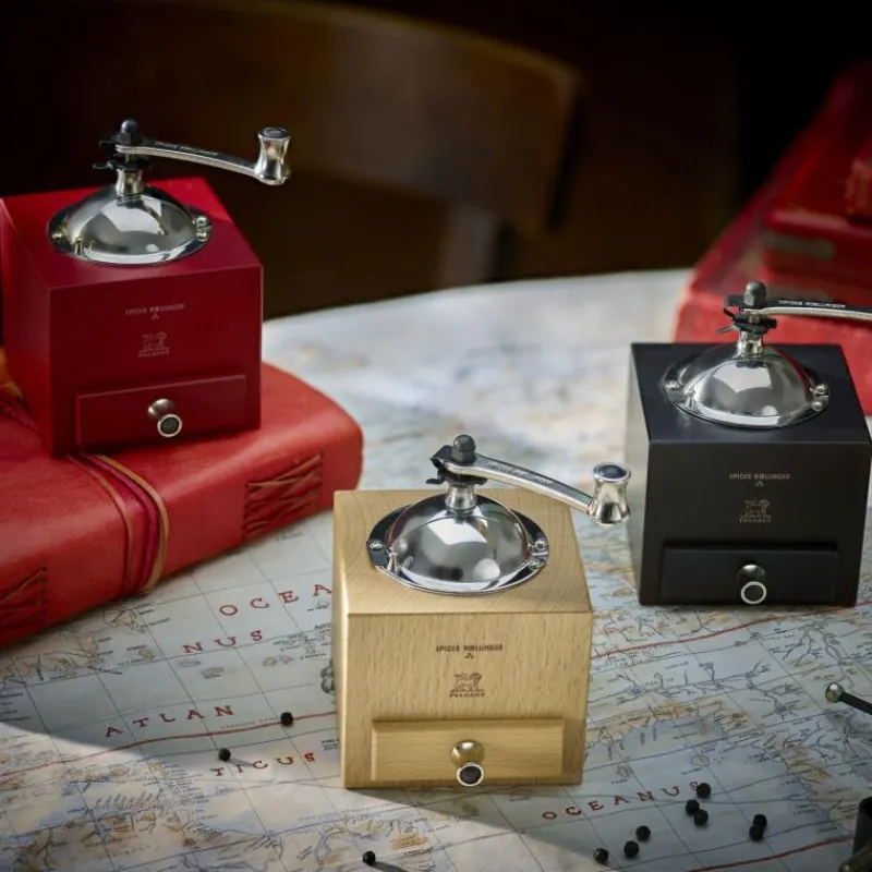 Das detailreiche Design der Gewürzmühle Roellinger von Peugeot ist an Gegenstände der klassischen Seefahrt angelehnt, durch die früher wertvolle Gewürze über die Ozeane reisten. Dieses besondere Aussehen erinnert dabei trotzdem noch an das Aussehen der klassischen Peugeot-Mühle und vereint so das Beste aus beiden Welten. Ein ganz besonderes Detail ist dabei die kleine Schublade, die das frische Mahlgut nach dem Kurbeln auffängt. Das Holz der Schublade wurde dabei ausgehöhlt statt eine traditionelle Lade zu formen. Das robuste, verstellbare Mahlwerk ist zum Mahlen von schwarzem, weißem, grünen oder rotem Pfeffer, rosa Beeren (max. 15% in einer Pfeffermischung) und Koriandersamen geeignet. Befüllt wird die Mühle durch eine Klappe am Edelstahlaufsatz, dann kann gekurbelt und frisches Mahlgut genossen werden. Die Mühle besteht aus lackiertem Holz und ist 13 cm hoch.