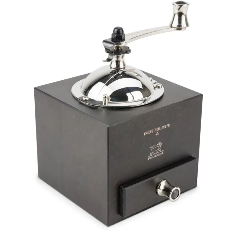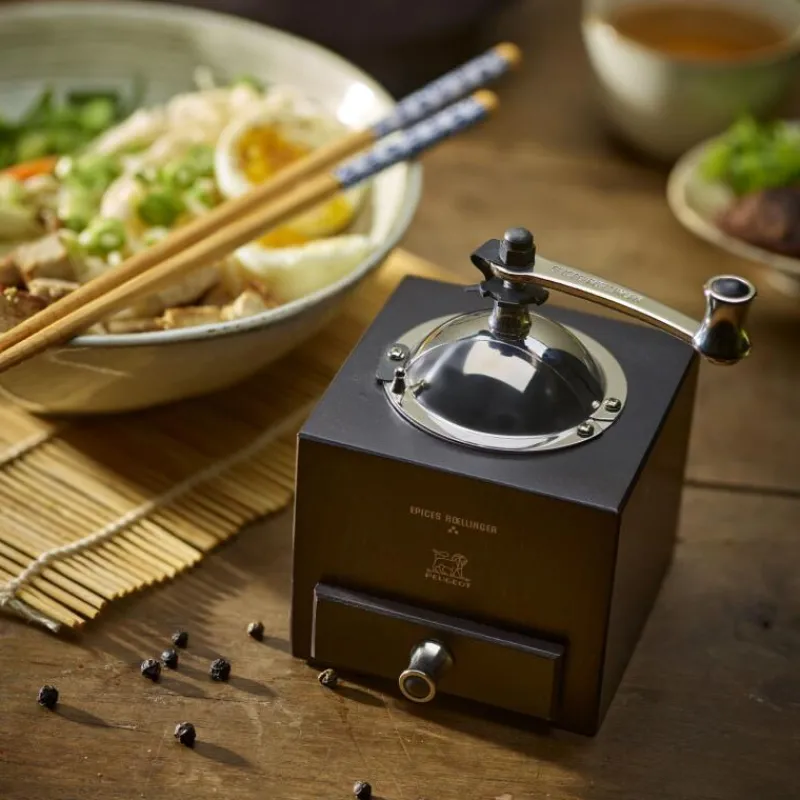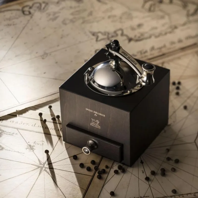 Das detailreiche Design der Gewürzmühle Roellinger von Peugeot ist an Gegnstände der klassischen Seefahrt angelehnt, durch die früher wertvolle Gewürze über die Ozeane reisten. Dieses besondere Aussehen erinnert dabei trotzdem noch an das Aussehen der klassischen Peugeot-Mühle und vereint so das Beste aus beiden Welten. Ein ganz besonderes Detail ist dabei die kleine Schublade, die das frische Mahlgut nach dem Kurbeln auffängt. Das Holz der Schublade wurde dabei ausgehöhlt statt eine traditionelle Lade zu formen. Das robuste, verstellbare Mahlwerk ist zum Mahlen von schwarzem, weißem, grünen oder rotem Pfeffer, rosa Beeren (max. 15% in einer Pfeffermischung) und Koriandersamen geeignet. Befüllt wird die Mühle durch eine Klappe am Edelstahlaufsatz, dann kann gekurbelt und frisches Mahlgut genossen werden. Die Mühle besteht aus lackiertem Holz und ist 13 cm hoch.