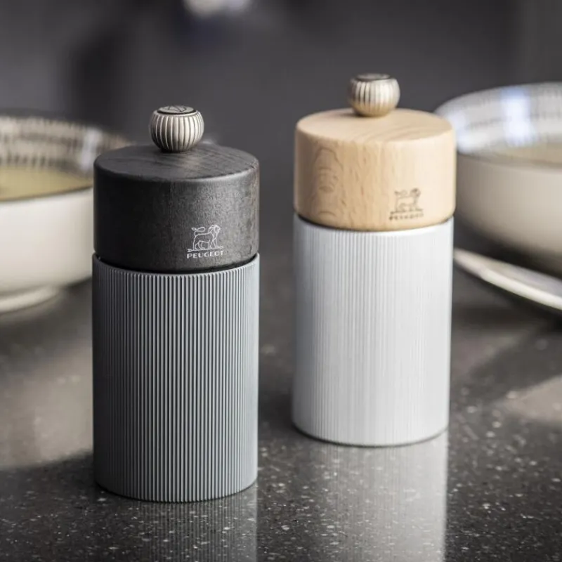 Elegant und modern präsentiert sich die Pfeffermühle aus der Line Serie von Peugeot in der Farbe Natur. Sie kombiniert auf raffinierte Weise zwei Materialien – Aluminium und Holz. Der edle fein gerillte Aluminiumkörper harmoniert wunderbar mit der Wärme der naturfarbenen Holzkappe. Die länglichen Rillen des Körpers wirken grafisch und mit etwas Licht entsteht ein glanzvoller Effekt. Die Mühle sind wie gewohnt mit dem Peugeot-Mahlwerk für Pfeffer ausgestattet. Das Stahl-Mahlwerk der Pfeffermühle wurde so konzipiert, dass es die Aromen von Pfeffer, aber auch von rosa Beeren in Pfeffermischungen und Koriandersamen offenbart. Der Mahlgrad der Mühle wird durch den Knopf am oberen Ende der Mühle verstellt. Insgesamt ist die Pfeffermühle 12 cm hoch.