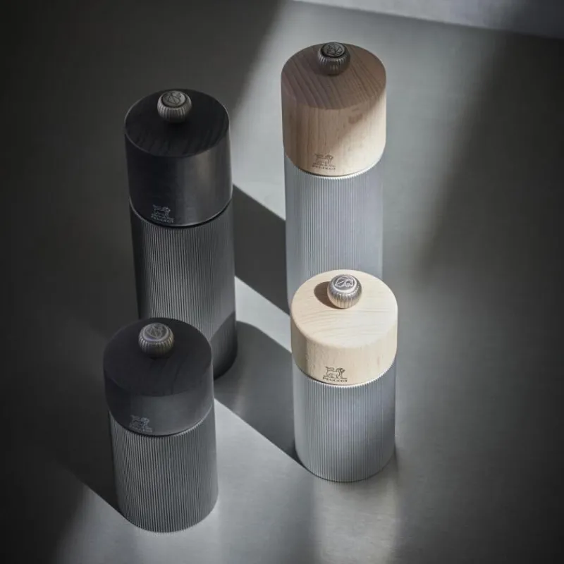 Elegant und modern präsentiert sich die Pfeffermühle aus der Line Serie von Peugeot in der Farbe Natur. Sie kombiniert auf raffinierte Weise zwei Materialien – Aluminium und Holz. Der edle fein gerillte Aluminiumkörper harmoniert wunderbar mit der Wärme der naturfarbenen Holzkappe. Die länglichen Rillen des Körpers wirken grafisch und mit etwas Licht entsteht ein glanzvoller Effekt. Die Mühle sind wie gewohnt mit dem Peugeot-Mahlwerk für Pfeffer ausgestattet. Das Stahl-Mahlwerk der Pfeffermühle wurde so konzipiert, dass es die Aromen von Pfeffer, aber auch von rosa Beeren in Pfeffermischungen und Koriandersamen offenbart. Der Mahlgrad der Mühle wird durch den Knopf am oberen Ende der Mühle verstellt. Insgesamt ist die Pfeffermühle 18 cm hoch.