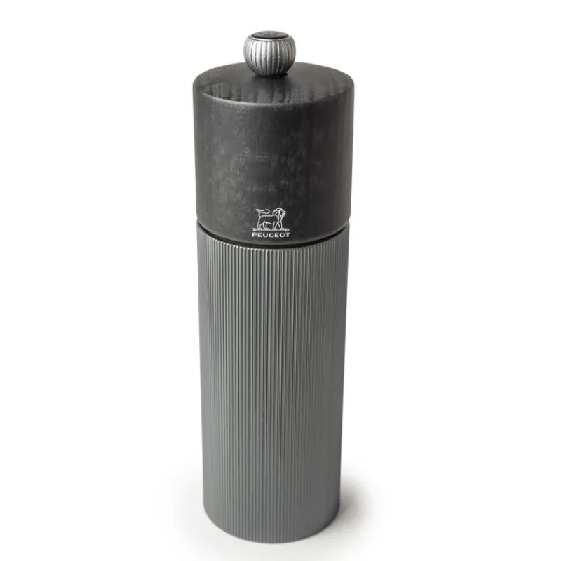 Elegant und modern präsentiert sich die Pfeffermühle aus der Line Serie von Peugeot in der Farbe Carbon Graphit. Sie kombiniert auf raffinierte Weise zwei Materialien – Aluminium und Holz. Der edle fein gerillte Aluminiumkörper harmoniert wunderbar mit der Wärme der grauen Holzkappe. Die länglichen Rillen des Körpers wirken grafisch und mit etwas Licht entsteht ein glanzvoller Effekt. Die Mühle sind wie gewohnt mit dem Peugeot-Mahlwerk für Pfeffer ausgestattet. Das Stahl-Mahlwerk der Pfeffermühle wurde so konzipiert, dass es die Aromen von Pfeffer, aber auch von rosa Beeren in Pfeffermischungen und Koriandersamen offenbart. Der Mahlgrad der Mühle wird durch den Knopf am oberen Ende der Mühle verstellt. Insgesamt ist die Pfeffermühle 18 cm hoch.