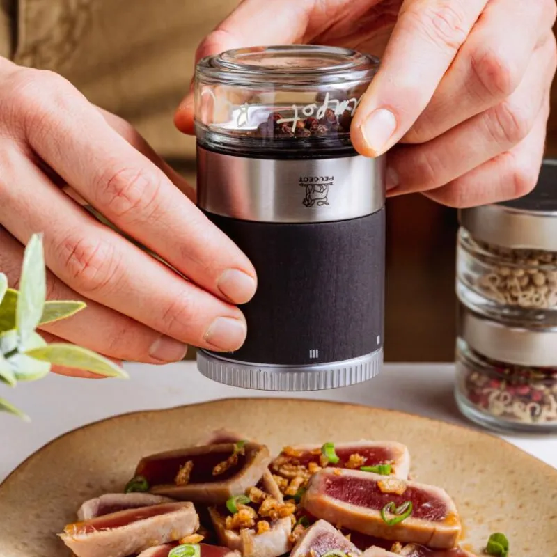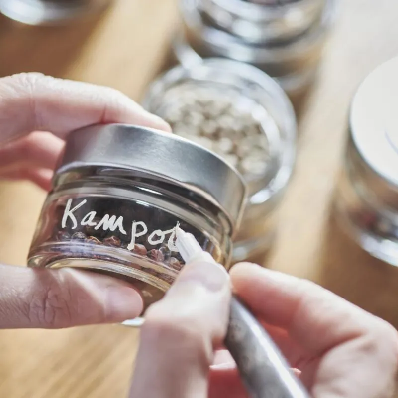 Die ikonische Pfeffermühle Maestro besteht aus einem Holzkörper und einem Glasbehälter, der abschraubbar und leicht wiederzubefüllen ist. Ihr Mahlwerk aus Stahl wurde so konzipiert, dass es die Aromen von Pfeffer, aber auch von rosa Beeren in Pfeffermischungen und Koriandersamen offenbart. Das u’Select-Einstellsystem weist sechs Voreinstellungen von sehr fein bis extra grob auf, mit dem Sie den Mahlgrad genau einstellen können. Dabei werden die Pfefferkörner erst vorgeschnitten und dann erst fein gemahlen, um den vollen Geschmack des Gewürzes zu entfalten. Im Geschenkset enthalten sind drei Glasbehälter sowie Sachets mit drei verschiedenen Sorten Pfefferkörnern: jeweils 20 Gramm schwarzer Kampot-Pfeffer, weißer Sikara-Pfeffer sowie wilder Voatsiperifery-Pfeffer überzeugen mit außergewöhnlichen Aromen. Außerdem ist ein weißer Filzstift enthalten, mit dem die Glasbehälter immer wieder neu beschriftet wrrden können.