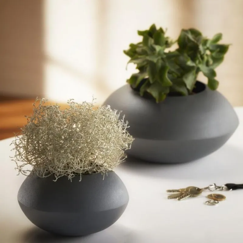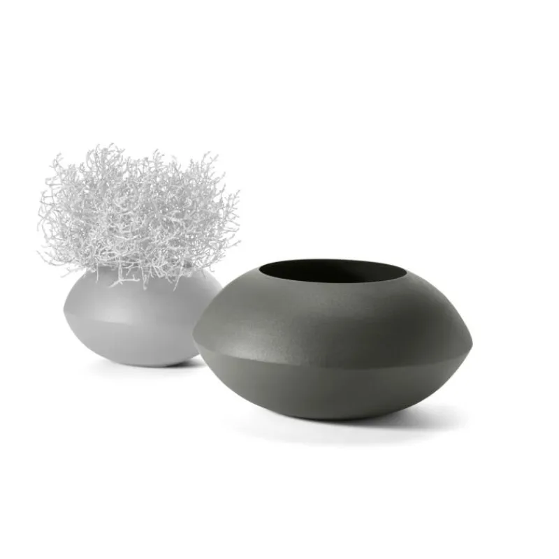 Ob getrocknete Gräser, Zweige und Blüten oder Küchenkräuter, Lavendel und Sukkulenten: die Hom Vase macht sowohl optisch als auch haptisch einen guten Eindruck und lässt sich auch prima als Übertopf verwenden. Die schiefergraue Beschichtung passt sich dabei jedem Wohnstil an und setzt einen zeitgemäßen Akzent in jeder Umgebung. Die Vase besteht aus pulverbeschichtetem Stahl, in der Größe L ist sie 13 cm hoch und hat einen Durchmesser von 27 cm.