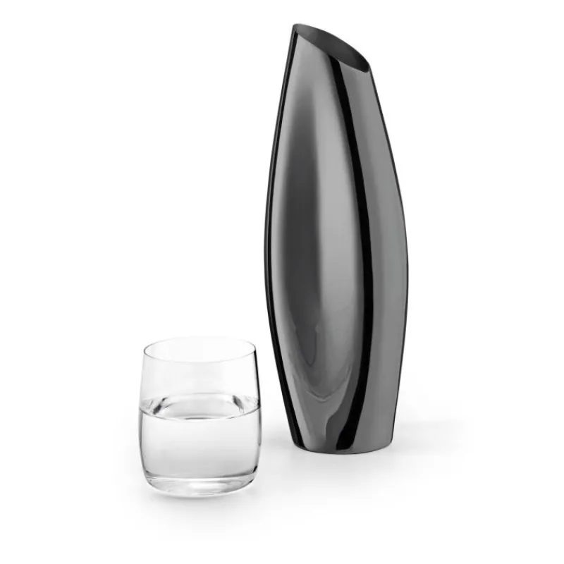 Mit ihrer wunderschön geschwungenen Form beeindruckt die Wasserkaraffe Julie und liegt dazu aufgrund der ausgeklügelten Gewichtsverteilung noch gut in der Hand. Sie besteht aus hochwertigem, polierten Edelstahl, auf dem aufgrund der abgedunkelten Farbe Fingerabdrücke deutlich weniger sichbar sind. Neben Wasser kann die Karaffe natürlich auch mit Säften, Limonade oder Eistee befüllt werden. Die Karaffe Julie ist 29 cm hoch, 10 cm lang und 7 cm breit. Sie hat ein Fassungsvermögen von einem Liter.