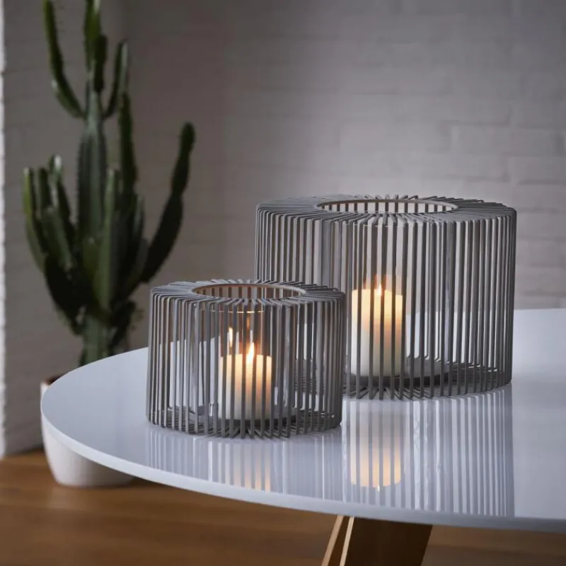 Das Windlicht Oslo ist auch ohne Beleuchtung ein echter Hingucker, aber erst bei Dämmerung entfaltet es seine ganze Wirkung. Sobald dann nämlich eine Kerze in seine Mitte gestellt wird, entsteht durch die dünnen Streben aus pulverbeschichtetem Stahl ein Schattenspiel, bei dem es nie langweilig wird zuzusehen. Dabei schützt der passende Glaseinsatz die Blockkerze vor Wind, damit ist das Windlicht beestens für den Außenbereich geeignet. Ein Bodeneinsatz fängt Kerzenwachs auf, sollte doch einmal etwas danebengehen. Das Windlicht Oslo ist in zwei Größen erhältlich, in der kleinen Variante ist es 14 cm hoch und hat einen Durchmesser von 21 cm.
