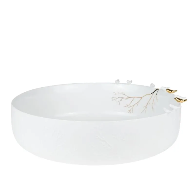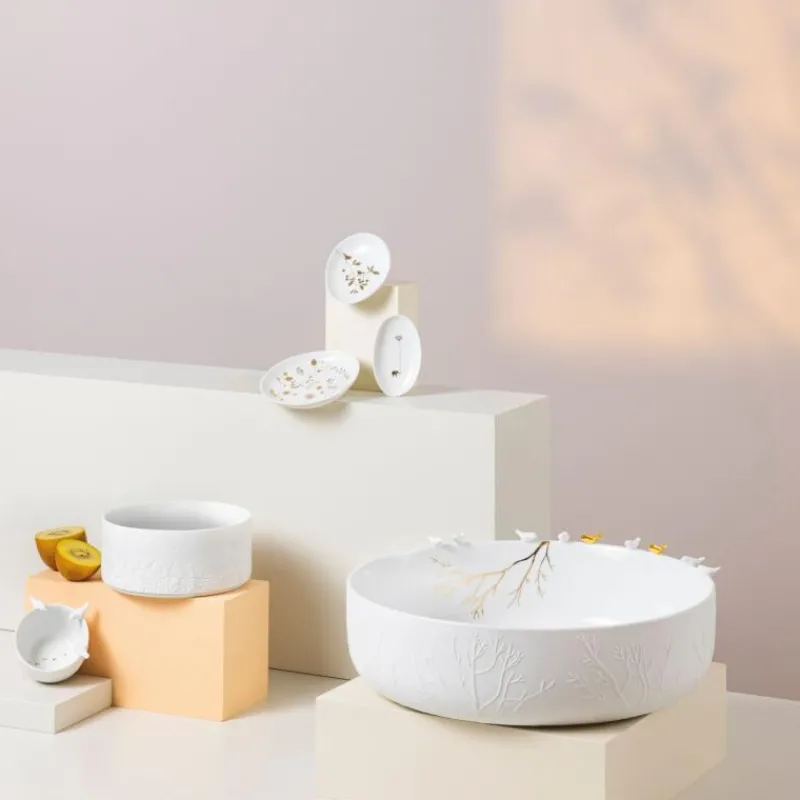 Viele einzigartige Stücke von Räder sind von der Natur inspiriert, so auch die Kollektion Goldvogel. In aufwendiger Fertigungstechnik wird das feine Porzellan durch den Einsatz verschiedener Gestaltungselemente eindrucksvoll zur Geltung gebracht. Die dezenten Glanzpunkte in Gold verleihen einen Hauch von Luxus, während aufgesetzte Vögel zum Kennzeichen der Serie werden und eine ganz eigene Geschichte erzählen. Die zart verästelten Zweige stehen in sanftem Kontrast zur glatten Oberfläche der Schale, die nur innen glasiert ist. Die große Vogelschwarm-Schale hat einen Durchmesser von 35,5 cm und ist 10 cm hoch.