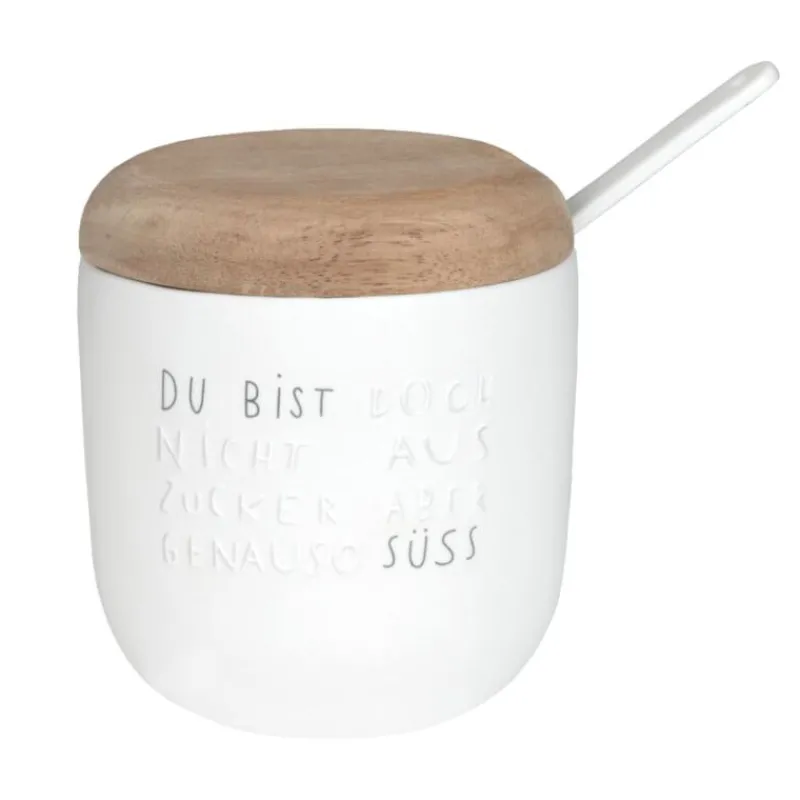 Die Zuckerdose von Räder sorgt schon am Frühstückstisch für ein Lächeln auf den Lippen. Der Teil des Spruches, der mit Decalfolie verziert wurde, fällt einem direkt ins Auge. Der mittlere Teil des Spruches, der in Reliefform auf dem schlichten Milchkännchen geprägt wurde, fällt einem erst bei genauerem Hinsehen auf und sorgt so für einen Schmunzler am Morgen. Der Deckel besteht aus unbehandeltem Akazienholz und bildet gemeinsam mit dem mitgelieferten Löffel die perfekte Kombination. Ob als romantische Hommage an den Frühstückspartner oder als lustiger Hingucker, gute Laune am Morgen ist garantiert. Die Dose ist 9,5 cm hoch und hat einen Durchmesser von 8,5 cm.
