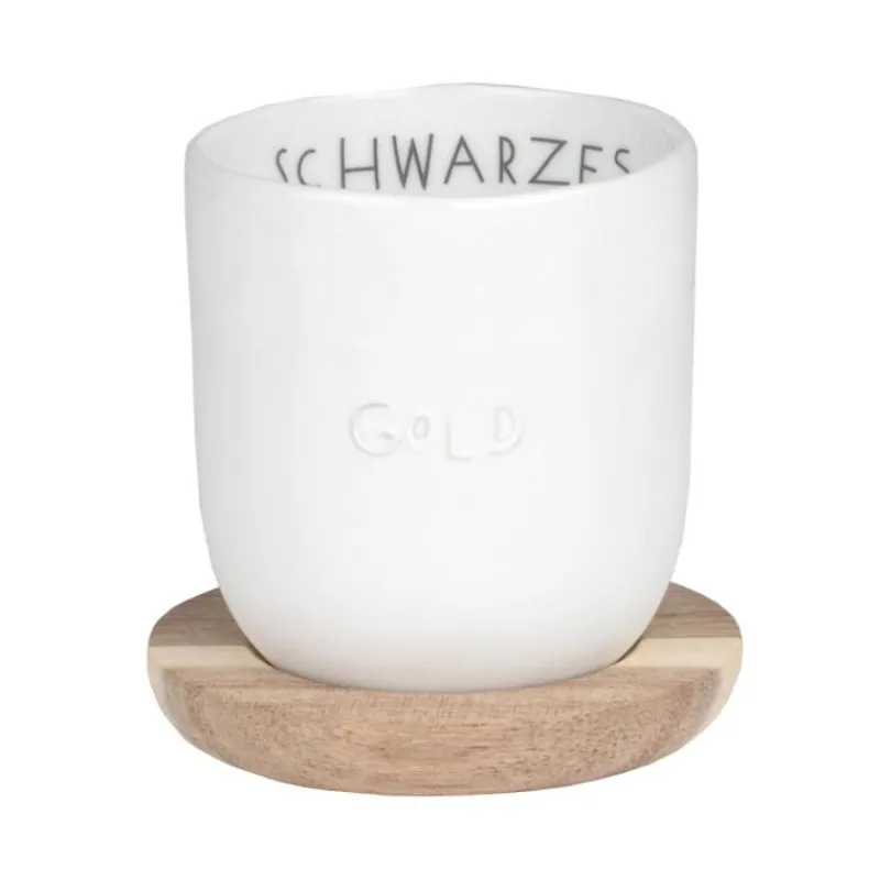 Die Becher von Räder versprühen schon am Morgen gute Laune. Der kleine Becher aus Porzellan, der innen komplett und außen am oberen Rand glasiert ist, sorgt mit seinem netten Spruch für ein Lächeln auf den Lippen oder ermöglicht es allen Espressoliebhabern einen Hinweis auf den Inhalt ihres Bechers zu geben. Besonders raffiniert: Der Spruch „Schwarzes Gold “ ist auf den Innen- und Außenteil des Bechers aufgeteilt und beim Austrinken des Getränks ist auf dem Boden des Bechers noch ein geprägtes Sternensymbol zu entdecken. Komplettiert wird das Set von einem kleinen Tellerchen aus unbehandeltem Akazienholz. Der Becher hat ein Volumen von 100 ml, ist 6 cm hoch und hat einen Durchmesser von 5,5 cm.