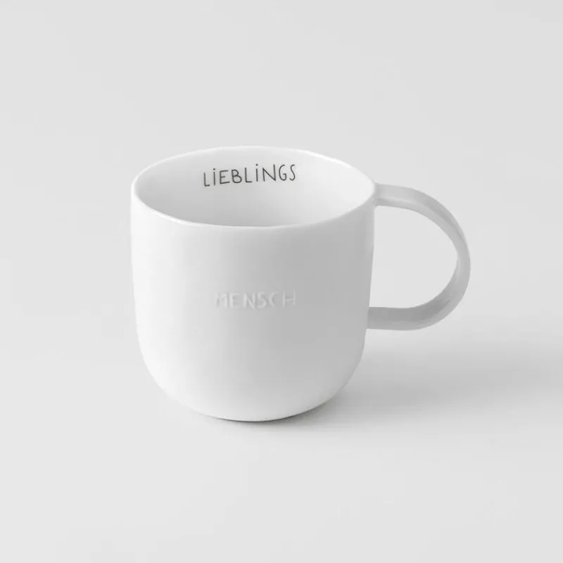 Die Tassen von Räder versprühen schon am Morgen gute Laune. Die Henkeltasse aus Porzellan, die innen komplett und außen am oberen Rand glasiert ist, sorgt mit ihrem netten Spruch für ein Lächeln auf den Lippen oder ermöglicht es dem Frühstückspartner eine Botschaft zu übermitteln. Besonders raffiniert: Das Wort „Lieblingsmensch“ ist auf den Innen- und Außenteil des Bechers aufgeteilt und beim Austrinken des Getränks ist auf dem Boden des Bechers noch ein geprägtes Herz zu entdecken. Die Tasse ist 8 cm hoch, hat einen Durchmesser von 8,5 cm und ein Volumen von 300 ml.