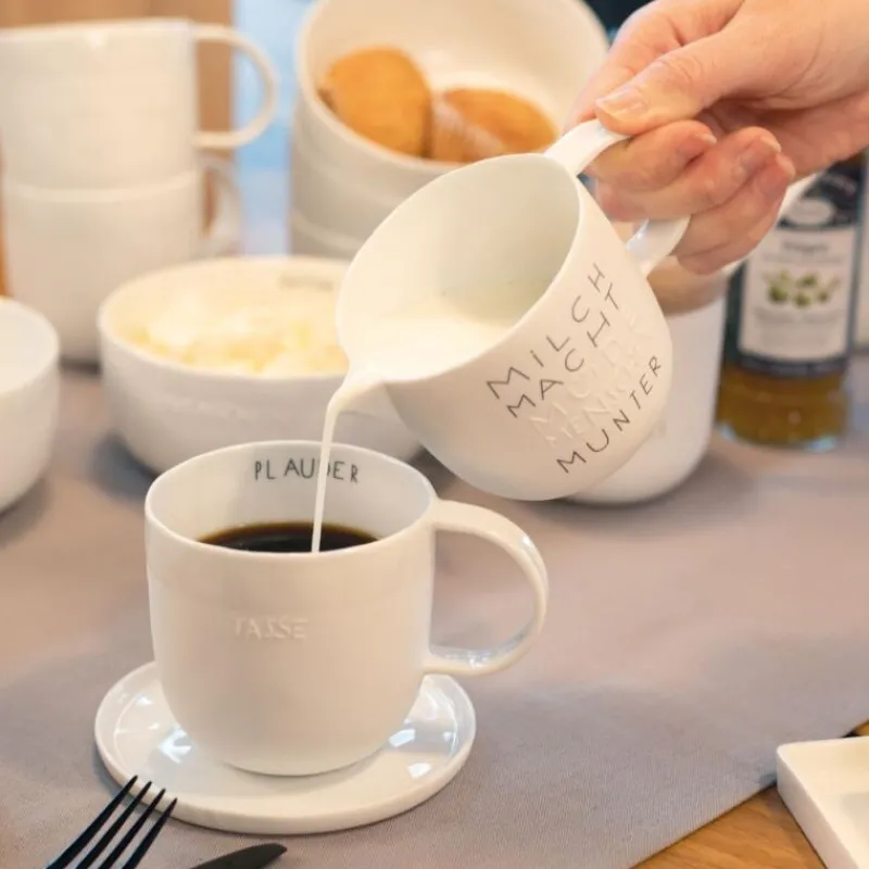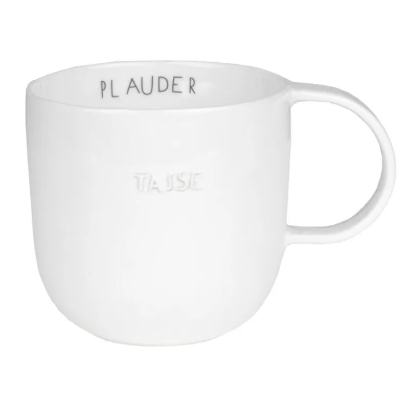 Die Tassen von Räder versprühen schon am Morgen gute Laune.Die Henkeltasse aus Porzellan, die innen komplett und außen am oberen Rand glasiert ist, sorgt mit ihrem netten Spruch für ein Lächeln auf den Lippen oder ermöglicht es dem Frühstückspartner eine Botschaft zu übermitteln. Besonders raffiniert: Das Wort „Plaudertasse“ ist auf den Innen- und Außenteil des Bechers aufgeteilt und beim Austrinken des Getränks ist auf dem Boden des Bechers noch ein geprägter Smiley zu entdecken. Die Tasse ist 8 cm hoch, hat einen Durchmesser von 8,5 cm und ein Volumen von 300 ml.