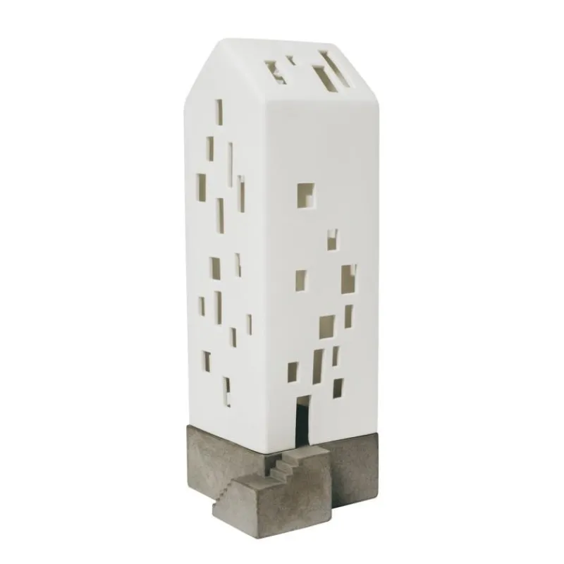 Mit viel Liebe zum Detail bringen die Lichthäuser von Räder die Welt zum Leuchten. Seit mehr als 25 Jahren bereichern die kleinen Porzellan-Häuser das Sortiment, dabei erzählt jedes Haus eine ganz eigene Geschichte, die sich hinter von Hand ausgeschnittenen, beleuchteten Fenstern und erhellten Türen versteckt. Gefertigt aus unglasierter, weißer Keramik lassen sich ganze Straßenzüge kombinieren, die gemeinsam um die Wette strahlen. Das große Apartmenthaus ruht auf einem modernen Betonsockel und zeichnet sich durch viele, unregelmäßig angeordnete Fenster aus. Das Lichterhaus ist 26 cm hoch, 9,5 cm breit und 9,5 cm tief.