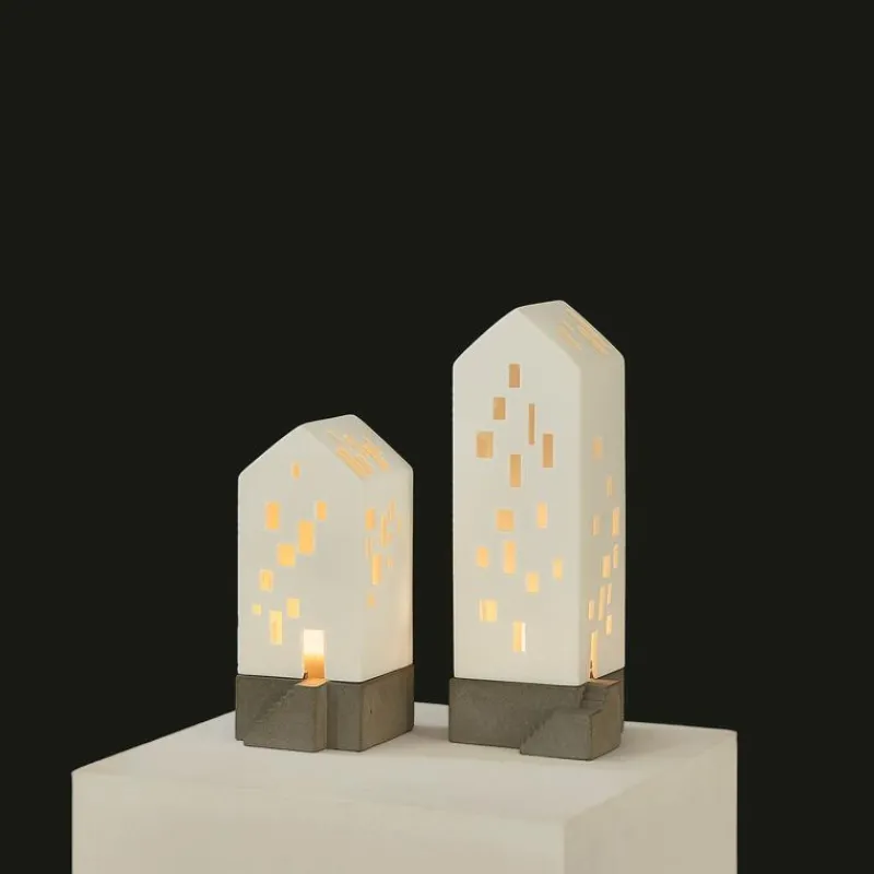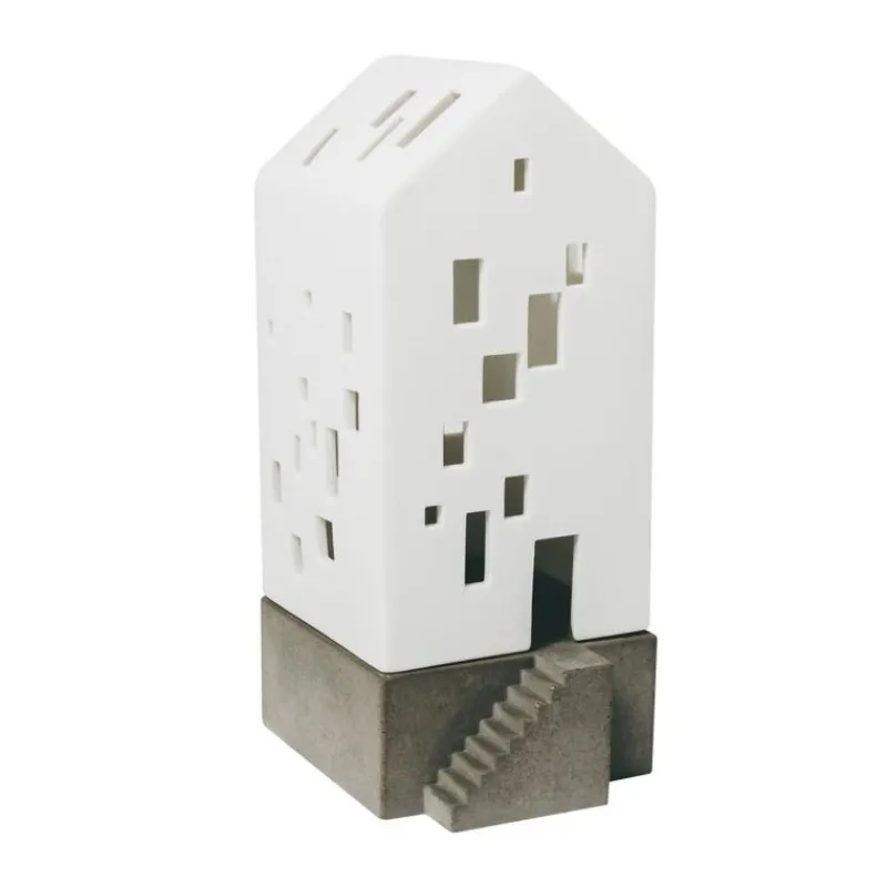 Mit viel Liebe zum Detail bringen die Lichthäuser von Räder die Welt zum Leuchten. Seit mehr als 25 Jahren bereichern die kleinen Porzellan-Häuser das Sortiment, dabei erzählt jedes Haus eine ganz eigene Geschichte, die sich hinter von Hand ausgeschnittenen, beleuchteten Fenstern und erhellten Türen versteckt. Gefertigt aus unglasierter, weißer Keramik lassen sich ganze Straßenzüge kombinieren, die gemeinsam um die Wette strahlen. Das kleine Apartmenthaus ruht auf einem modernen Betonsockel und zeichnet sich durch viele, unregelmäßig angeordnete Fenster aus. Das Lichterhaus ist 19 cm hoch, 9,5 cm breit und 8 cm tief.
