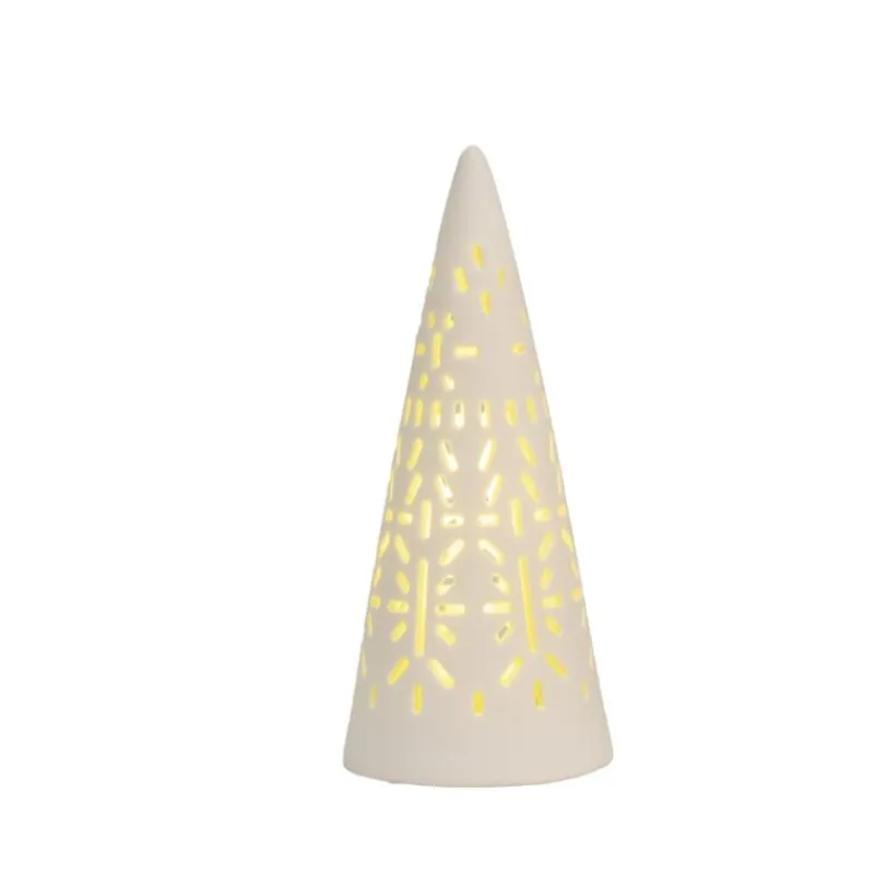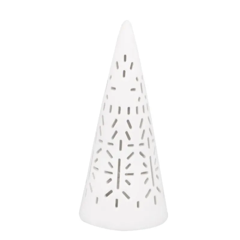 Die Lichttannen von Räder bringen Licht ins Dunkle: die mit einem batteriebetriebenen LED-Licht ausgestatteten Tannen erschaffen mit ihrem angenehmen Leuchten eine gemütliche Atmosphäre. Sie bestehen aus mattweißem Porzellan und sind mit unterschiedlichen Lochmustern versehen, durch die das Licht erstrahlt und kleine Schatten wirft. Sie lassen sich phantasievoll zu kleinen Gruppen zusammenstellen und ergeben so eine liebevolle Dekoration im Wohnbereich. Betrieben wird das LED-Modul mit zwei LR44-Batterien, die im Lieferumfang enthalten sind. In der mittleren Größe ist die Tanne 9,5 cm hoch und hat einen Durchmesser von 4 cm.