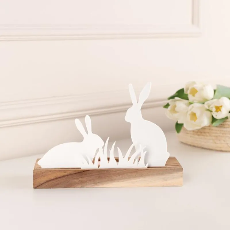 Die Kollektion Lichtobjekte entfaltet ihren magischen Charme besonders dann, wenn hinter dem Dekorationsobjekt Teelichter entzündet werden. Zwischen den zarten Elementen aus Porzellan entsteht so ein wunderschönes Spiel aus Licht und Schatten. Das österliche Lichtobjekt besteht aus zwei Hasen, die auf einer Wiese sitzen. Die drei Dekorationselemente lassen sich ganz nach Belieben in der Leiste aus unbehandeltem Akazienholz unterschiedlich anordnen und verschieben. Das Lichtobjekt Ostern ist eine minimalistische zu klassischer Dekorations zum Frühlingsfest und lässt sich auch prima verschenken. Das Lichtobjekt ist 20 cm lang und 14 cm hoch.