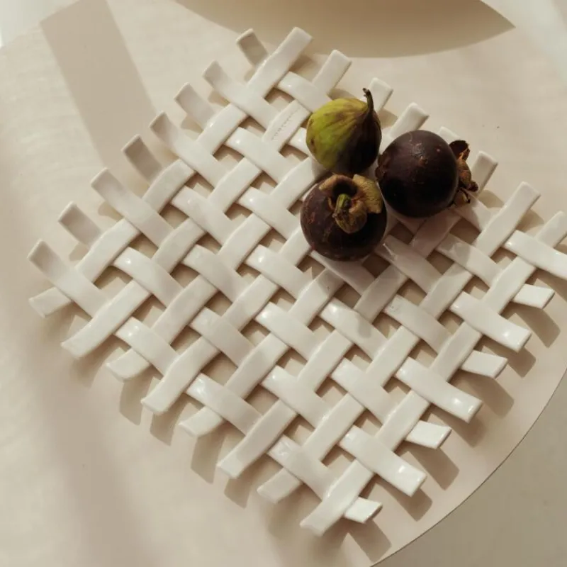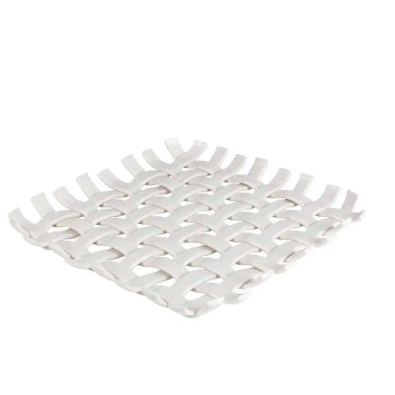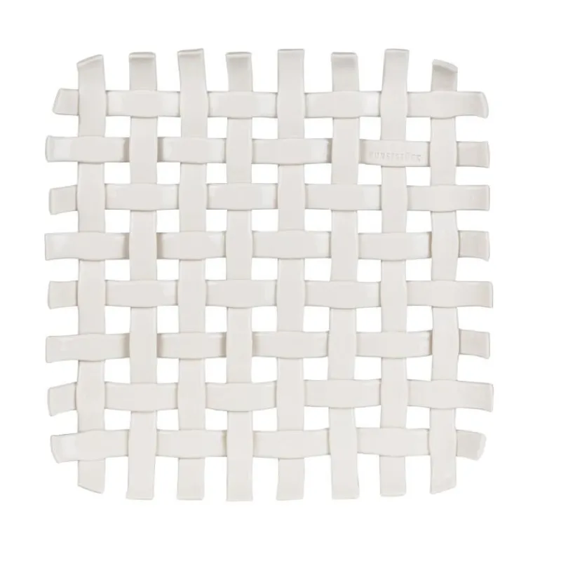 Die flache Schale Flechterei aus glasiertem Porzellan ist, getreu dem Namen, wie ein Korb geflochten. Aufgrund der glatten, abwaschbaren Oberfläche kann sie hervorragend als Obstschale oder Brotkorb genutzt werden und verschönert so jede Tafel. Aber auch ohne Inhalt ist die Flecht-Schale ein moderner Hingucker für Ihr Zuhause. Verziert ist sie mit dem gedruckten Wort „Kunststück“, welches wie ein Stempel in das Porzellan eingefügt ist. Die Schale hat eine Seitenlänge von 25 cm und ist 1,8 cm hoch.