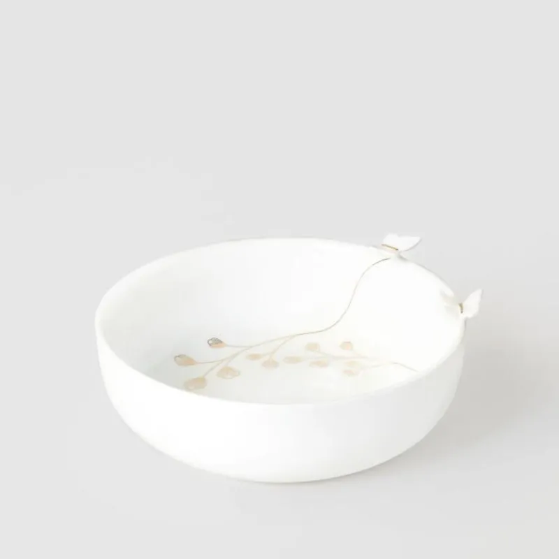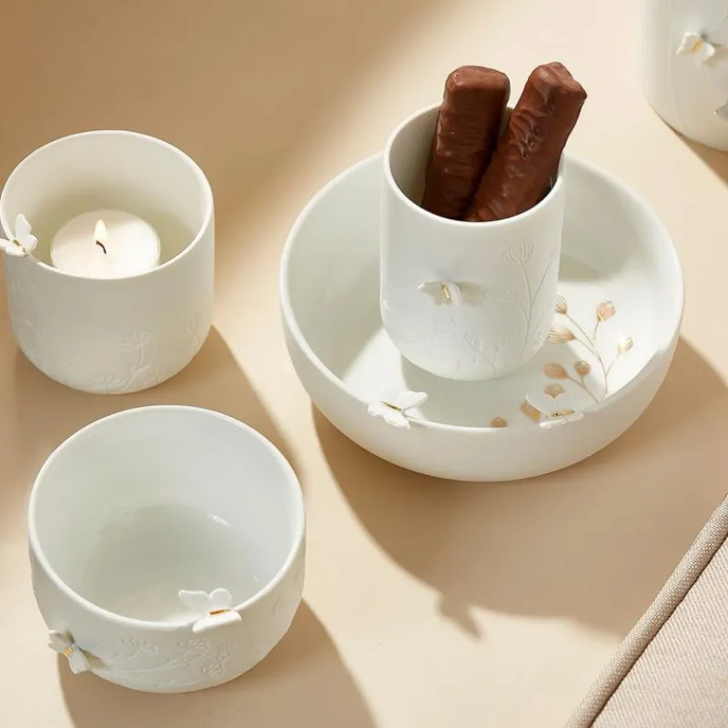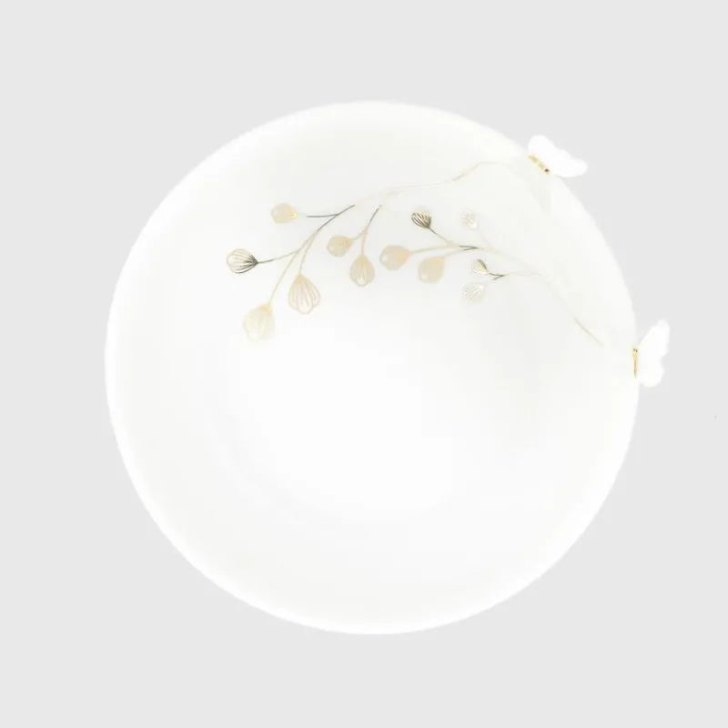 Sanfte Ranken mit sich wie im Wind zu wiegen scheinende Blätter und die namensgebenden Schmetterlinge zieren die Artikel der Serie Schmetterling. Die feinen Insekten scheinen auf dem dünnen Rand der Schale zu sitzen, als hätten sie sich nur kurz niedergelassen. Die große Schale mit einem Durchmesser von 14 cm wirkt schon ohne Dekoration, lässt sich aber auch hervorragend mit Obst, Süßigkeiten und anderen Lebensmitteln befüllen, um so noch dekorativer zu wirken.