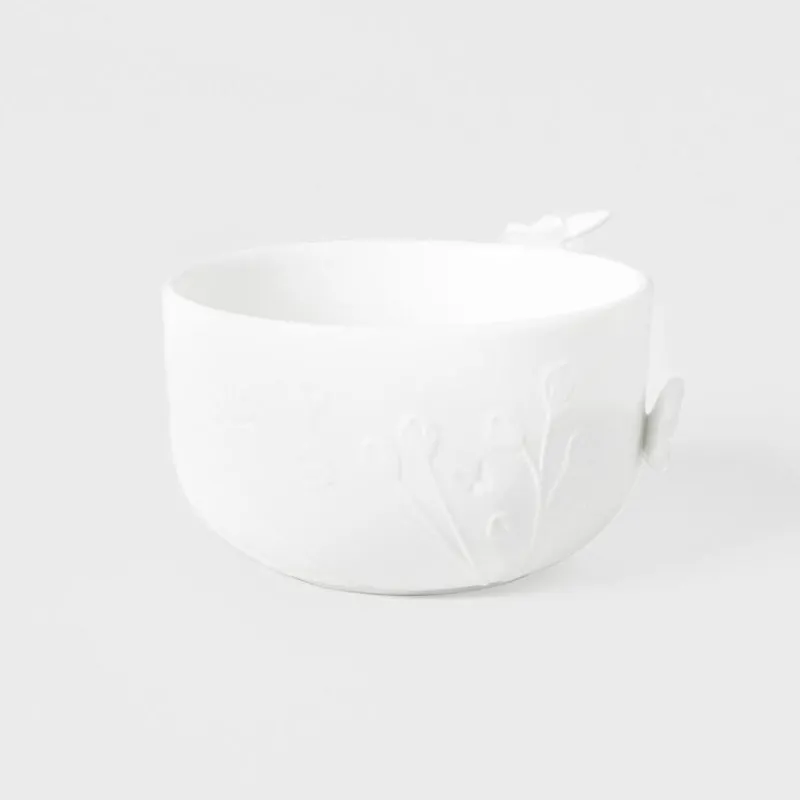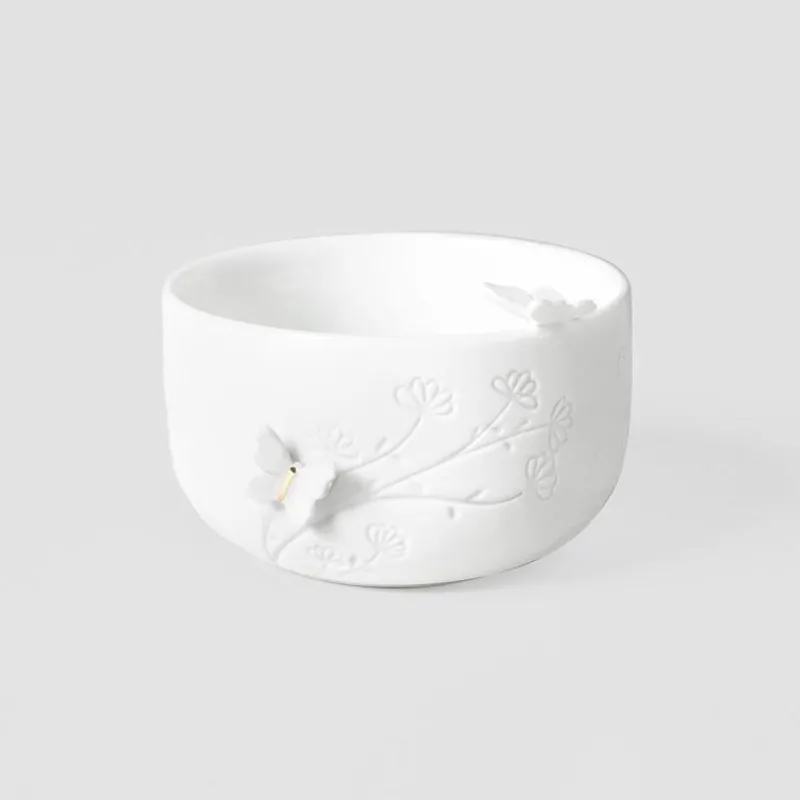 Sanfte Ranken mit sich wie im Wind zu wiegen scheinende Blätter und die namensgebenden Schmetterlinge zieren die Artikel der Serie Schmetterling. Die feinen Insekten scheinen auf dem dünnen Rand der Schale zu sitzen, als hätten sie sich nur kurz niedergelassen. Die kleine Schale mit einem Durchmesser von 9 cm wirkt schon ohne Dekoration, lässt sich aber auch hervorragend mit Süßigkeiten oder Schmuck befüllen, um so noch dekorativer zu wirken.
