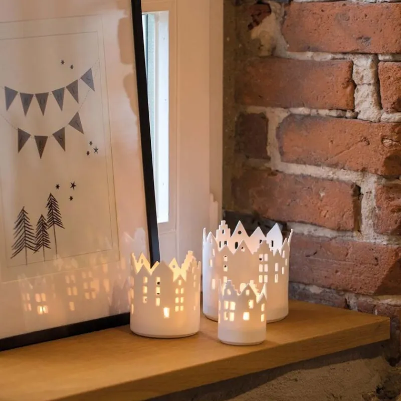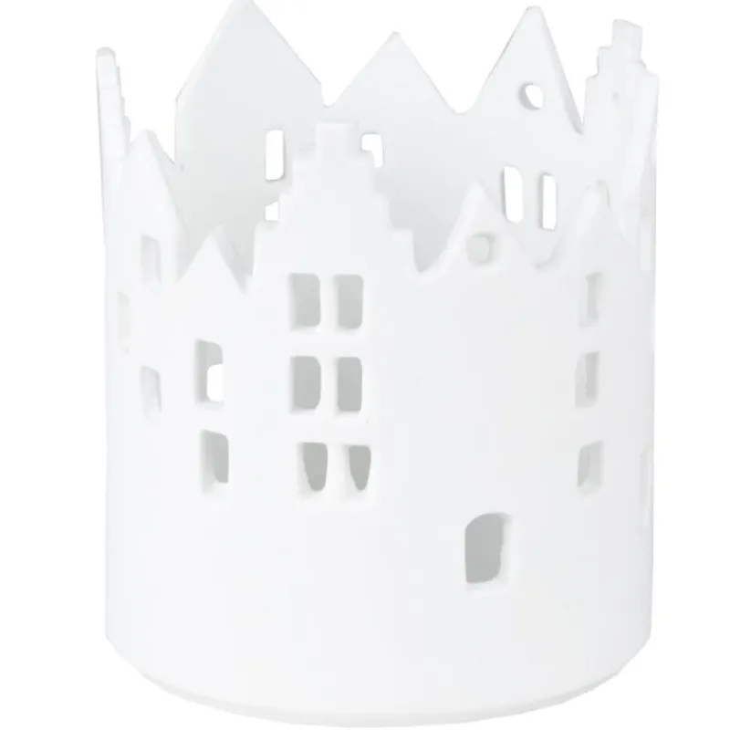 Mit viel Liebe zum Detail bringen die Stadtlichter von Räder die Welt zum Leuchten.Jedes Haus eine ganz eigene Geschichte, die sich hinter von Hand ausgeschnittenen, beleuchteten Fenstern und erhellten Türen versteckt. Gefertigt aus unglasierter, weißer Keramik lassen sich ganze Straßenzüge kombinieren, die gemeinsam um die Wette strahlen. Das Stadtlicht Rathausplatz ist 9 cm hoch und hat einen Durchmesser von 8 cm. Es bietet Platz für ein Teelicht.