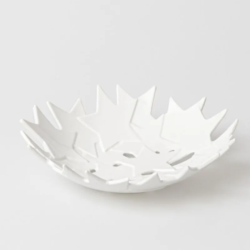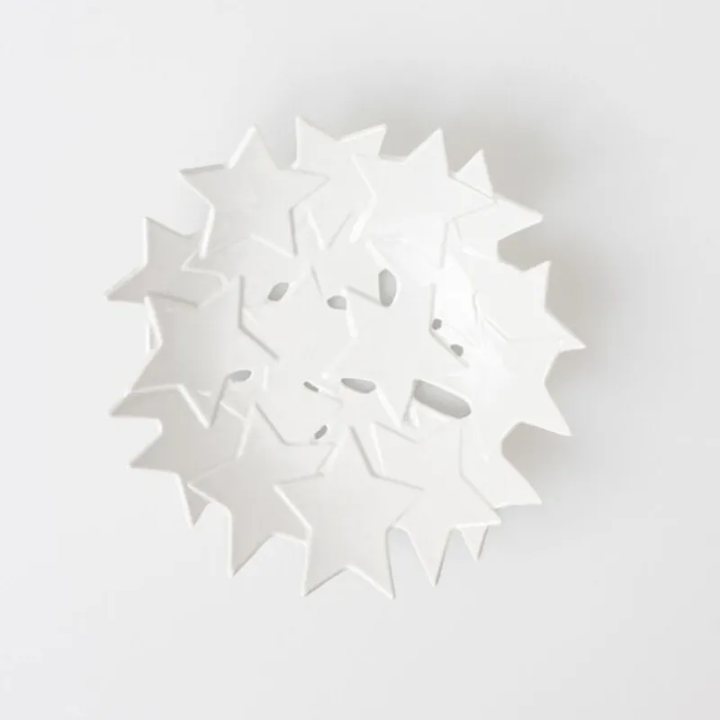 Die Schale, die aus vielen sich überlappenden Sternen besteht, besticht mit ihrer Unregelmäßigkeit und den intuitiv angeordneten Sternen. Die fünfzackigen Sterne bilden dadurch unterschiedlich große Lücken und lassen die Schale besonders charmant und frisch wirken. Ob als Plätzchenschale in der Weihnachtszeit oder neutraler Hingucker: die Sternschale lässt sich auf die unterschiedlichsten Weisen arrangieren. Die kleine Variante der Sternschale hat einen Durchmesser von 20 cm, ist 5 cm hoch und besteht aus glasiertem Porzellan.