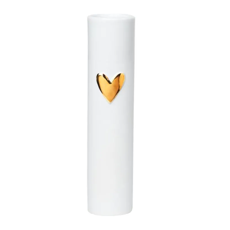 Die formschöne Herz-Vase von Räder berührt nicht nur die Herzen von Verliebten, sie ist auch ein hervorragendes Herzensgeschenk an eine liebe Freundin oder die eigenen Eltern. Sie besteht aus feinem, weißen Porzellan, das von innen glasiert ist, um die Vase wasserfest für eine frische Blüte oder einen kleinen Zweig zu machen. Ihr besonderes Merkmal ist das erhabene Herz, das mit glänzender Goldfarbe versehen ist. So wird ihr Zweck elegant in den Vordergrund gerückt. Die Herz-Vase ist 17 cm hoch und hat einen Durchmesser von 5,5 cm.
