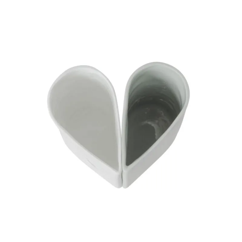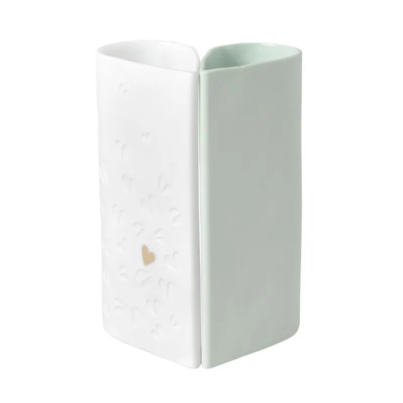 Eine Hochzeit vereint zwei Charaktere, zwei Familien und zwei Herzen: ein perfekter Anlass, um das zweiteilige Vasen-Set aus innen glasiertem Porzellan von Räder zu verschenken. Die Vasen sind wie ein Blütenblatt geformt, zusammen ergeben sie, wenn man sie von oben betrachtet, ein vollständiges Herz. Eine der Vasen ist mit dem namensgebenden, herzfäörmigen Relief versehen, die andere ist ganz glatt und hellgrün gefärbt. Die Vasen sind ideal für einzelne Blüten, Zweige oder kleine Sträuße geeignet. Zusammen ergibt das Set das perfekte Geschenk zur Hochzeit, zum Jahrestag oder einfach als Aufmerksamkeit für eine geliebte Person. Die Vasen sind 7,5 cm breit, 4,5 cm tief und 13 cm hoch.