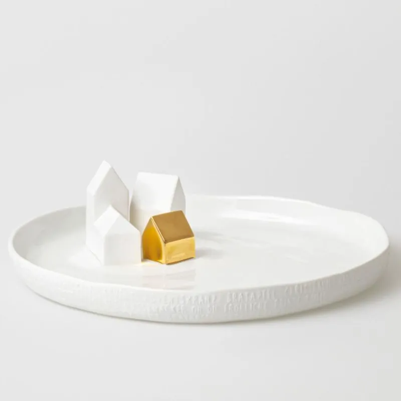 Der unregelmäßig gearbeitete Teller überzeugt mit seiner unebenen Oberfläche. Diese steht im Kontrast zu den minimalistisch gearbeiteten Häusern. Die vier unterschiedlich großen Häuser sind als Arrangement angeordnet. Außen ziert den Teller eine Vielzahl von weihnachtlichen Wörtern. Die Wörter, beispielsweise Heiligabend, Lebenkuchen, Gabentisch und Lichterglanz, sind in einer dezenten Reliefoptik geprägt. Ob als Dekorationsobjekt, beliebig beispielsweise mit Tannenzweigen und Weihnachtskugeln ergänzt oder als Plätzchenteller, der Winterlandschaft Teller von Räder bildet einen optischen Blickfang und hat einen Durchmesser von 35 cm.