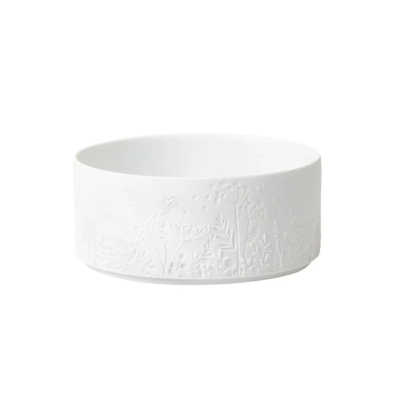 Zarte Blüten, sanfte Ranken und sich wie im Wind zu wiegen scheinende Blätter zieren die Artikel der Serie Wundergarten. Dabei spielt das Design mit den Gegensätzen zwischen der erhabenen Prägung sowie dem tiefergestezten Relief im Porzellan, was je nach Blickwinkel ein interessantes Schattenspiel entstehen und das Muster fast schon lebendig erscheinen lässt. Die kleine Servierschale mit einem Durchmesser von 16 cm wirkt schon ohne Dekoration, lässt sich aber auch hervorragend mit Obst, Gemüse und anderen Lebensmitteln befüllen, um so noch dekorativer zu wirken.