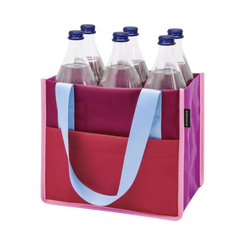 Platz für bis zu sechs Flaschen bietet die stabile Flaschentasche Berry von Remember. Sie besteht aus 100% recyceltem Polyester und ist mit zwei stabilen Trageriemen und einer Seitentasche ausgestattet. So steht einem Ausflug ins Grüne, einem leckeren Picknick oder dem Camping-Urlaub nichts mehr im Weg. Die Flaschentasche ist 27 cm breit, 24 cm tief und 18 cm hoch.