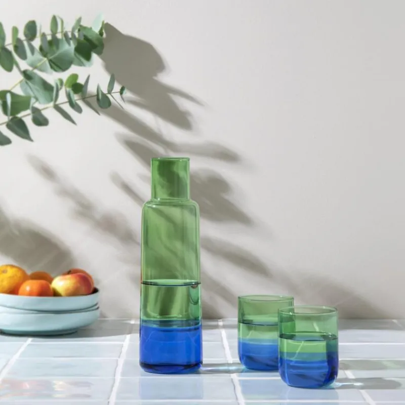 Für ein fröhliches, maritimes Flair sorgt die Wasserkaraffe Ocean von Remember. Wenn sie mit Wasser gefüllt wird, ergibt sich je nach Lichteinfall ein changierendes Farbenspiel, so kommt ein Hauch von Luxus in Ihren Alltag! Da die Karaffe aus hitzebeständigem Glas gefertigt ist, ist sie robust und hält auch extremeren Temperaturen stand. Zudem kann sie problemlos in der Spülmaschine gereinigt werden. Da die Karaffe in Handarbeit gefertigt wird, ist jedes Stück ein Unikat und kann leicht in Farbe oder Form abweichen. Die Wasserkaraffe hat ein Volumen von 1100 ml, sie ist 28 cm hoch und hat einen Durchmesser von 9 cm. Passende Wassergläser sind separat erhältlich.