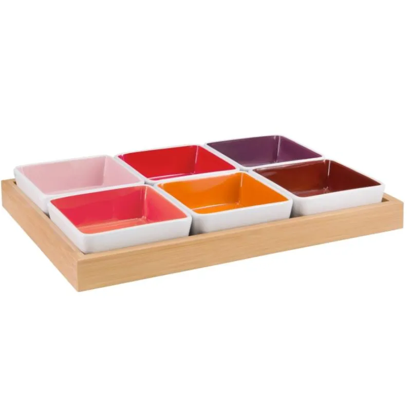 Für farbenfrohe Abwechslung auf dem Esstisch sorgt das sechsteilige Schalenset mit Tablett aus Bambusholz von Remember. In den bunten Schälchen aus Porzellan lassen sich Käse, Wurst, Oliven, Pesto und andere Leckerein auf einer ganz neuen Ebene servieren! Ob Tapas am Abend, leckere Grillsaucen oder Knabberzeug für Zwischendurch, das Schalenset macht einfach gute Laune und serviert seinen Inhalt auf ansprechende Weise. Die Schalen sind bis zu 250 Grad ofenfest und für die Reinigung in der Spülmaschine geeignet. Sie haben eine Seitenlänge von 10,5 cm, das Tablett ist 33 x 22,5 cm groß.