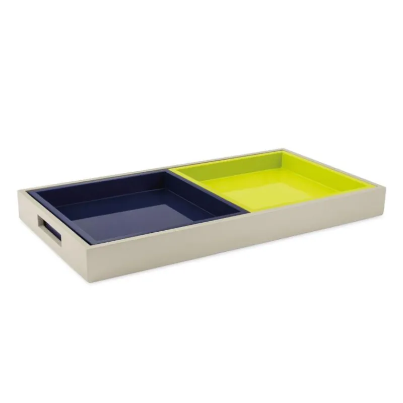 Ein absoluter Eye-Catcher in Ihrem Wohnzimmer: das dreiteilige Tablett-Set Trias aus lackiertem Holz bringt Farbe in Ihr Leben und macht mit seinem bunten Muster einfach gute Laune. Die Tabletts sind mit einer unempfindlichen UV-Lackierung versehen, die sie nicht nur besonders strahlen lässt, sondern auch vor Kratzern schützt. Ein Samtboden auf der Unterseite verhindert, dass die Tischoberfläche Schaden nimmt. Das Tablett ist perfekt zum Dekorieren und Aufbewahren von Kleinigkeiten geeignet, dabei entstehen immer neue Möglichkeiten, je nachdem, wie die Tabletts miteinander kombiniert werden. Das große Tablett hat die Maße 25 x 50 x 4,5 cm; die beiden kleinen Tabletts sind passgenau abgestimmt und messen 23,5 x 23,5 x 3,5 cm.