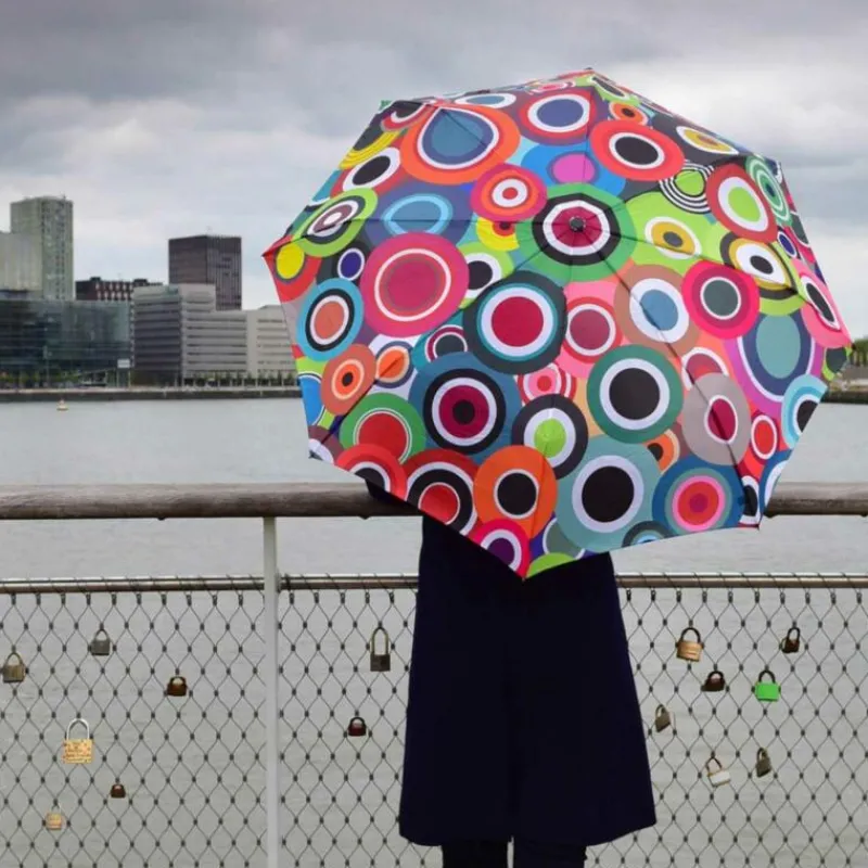 Der handliche Taschenschirm mit dem farbenfrohen Muster Rondo passt in jede Tasche und schützt zuverlässig vor Regengüssen und anderem Schauerwetter. Sobald die Sonne wieder scheint, reicht ein Knopfdruck aus und der Schirm verschwindet in seiner passenden Schutzhülle. Mit der Schlaufe aus Gummi lässt er sich auch am Handgelenk tragen und ist so immer schnell zur Hand. Der Taschenschirm Rondo ist im geschlossenen Zustand nur 29 cm lang, geöffnet verlängert er sich auf 58 cm und hat dann einen Durchmesser von einem Meter. Er besteht aus Metallverstrebungen und Schirmseide und wiegt nur leichte 395 Gramm.
