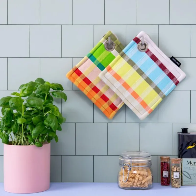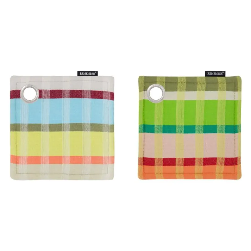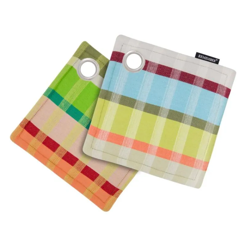In vielen Küchen müssen Topflappen möglichst schlicht sein, damit sie nicht auffallen – das Topflappen-Set von Remember müssen Sie aber nicht verstecken! Die fröhlichen Farben werten Ihre Küche auf und fördern sogar den Spaß an der Hausarbeit. Auch als kleines Mitbringsel oder Gastgeschenk sind die Topflappen bestens geeignet. Im Set enthalten sind zwei Topflappen mit unterschiedlichen Designs, die aus 100 % Baumwolle bestehen. Sie sind bis 40 Grad waschbar und haben die Maße 18,5 x 18,5 cm.