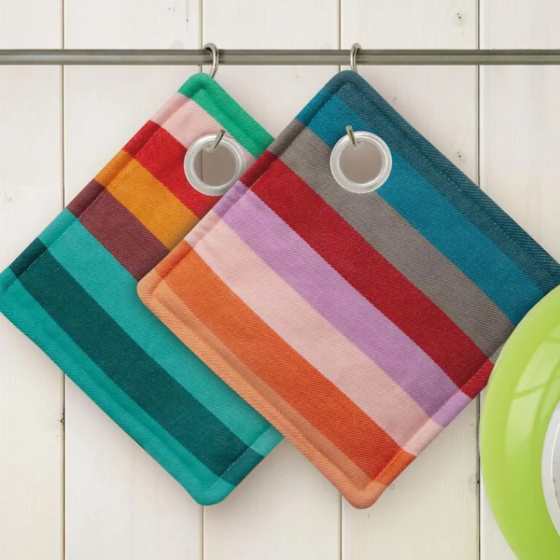 In vielen Küchen müssen Topflappen möglichst schlicht sein, damit sie nicht auffallen – das Topflappen-Set von Remember müssen Sie aber nicht verstecken! Die fröhlichen Farben werten Ihre Küche auf und fördern sogar den Spaß an der Hausarbeit. Auch als kleines Mitbringsel oder Gastgeschenk sind die Topflappen bestens geeignet. Im Set enthalten sind zwei Topflappen mit unterschiedlichen Designs, die aus 100 % Baumwolle bestehen. Sie sind bis 40 Grad waschbar und haben die Maße 18,5 x 18,5 cm.