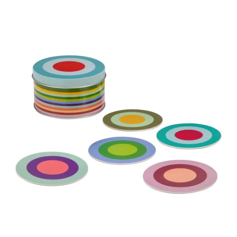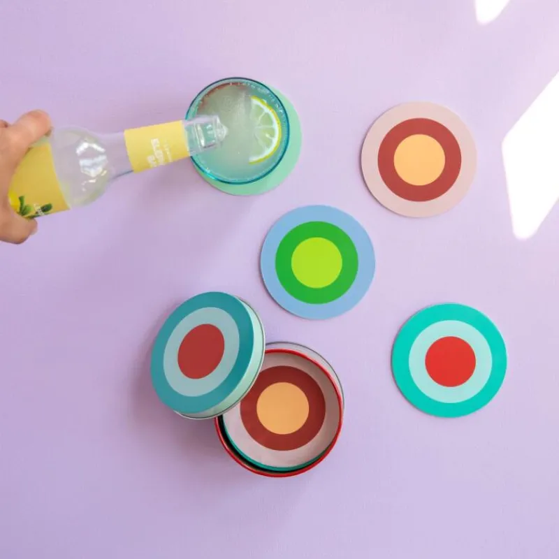 Schutz vor unschönen Wasserflecken auf der Tischoberfläche bieten die Untersetzer aus dem Set Ronda von Remember. Die hübschen Untersetzer bringen Farbe auf den Tisch und können dank der laminierten Oberfläche mit einem feuchten Tuch gereinigt und mehrfach verwendet werden. Sie bestehen aus robuster Pappe, sind lebensmittelecht und sollten trocken gelagert werden und nicht länger mit Wasser in Kontakt kommen. Im Lieferumfang enhalten ist eine praktische Aufbewahrungsdose aus buntem Weißblech. Im Set enthalten sind 20 Untersetzer mit einem Durchmesser von jeweils 9,3 cm.