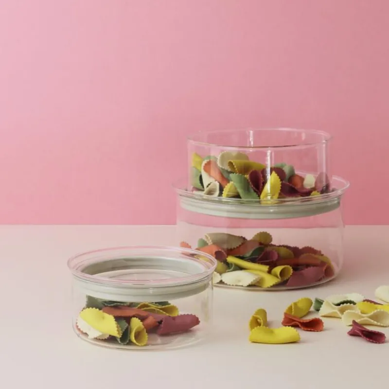 Die Store-It Aufbewahrungsdosen wurden für die Aufbewahrung von z. B.Haferflocken, Nudeln und Nüssen in der Küche entworfen. Das minimalistische, cleane Design in Zylinderform nimmt in der Küche wenig Platz weg und mit Hilfe des transparenten Glases ermöglicht es auf einen Blick den Inhalt zu erkennen. Der Silikonring sorgt dafür, dass der Deckel das Aufbewahrungsglas dicht verschließt und es so keine Gerüche abgibt oder von anderen Lebensmitteln annimmt. Die Gläser können auch im Kühlschrank zur Aufbewahrung von verschiedensten Lebensmitteln verwendet werden. Das Aufbewahrungsglas ist 6,2 cm hoch, hat einen Durchmesser von 12 cm und sollte nur von Hand gereinigt werden.