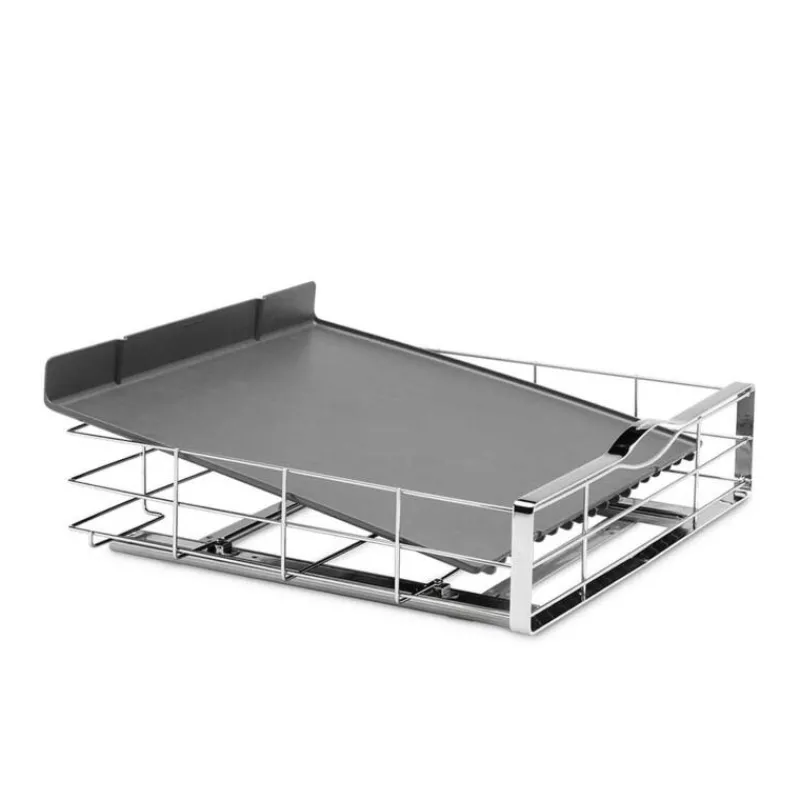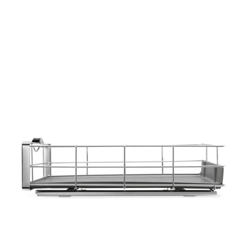 Der ausziehbare Schrank-Organisator von Simplehuman reduziert Unordnung in Schränken und ermöglicht es, schwer zugängliche Küchenschrankräume zu nutzen. Sein Rahmen besteht aus schwerem Stahl mit vorjustierten Kugellagerschienen, der bis zu 9 kg Gewicht aufnehmen kann. Unter dem Organisator liegt ein strapazierfähiger Tropfenschutz, der die Schränke vor Krümeln und ausgelaufenen Resten. Der Schrank-Organisator kann ganz einfach installiert und dank der Stahlgriffe schnell aus dem Schrank gezogen werden. Er ist 50,8 cm lang und 50,8 cm breit und besteht poliertem Edelstahl.