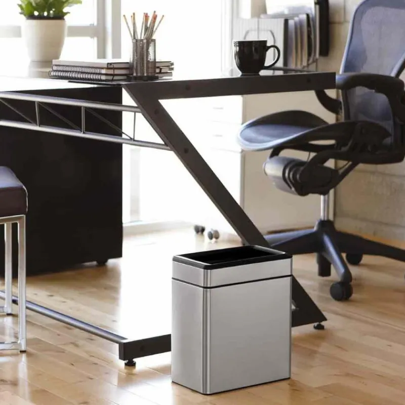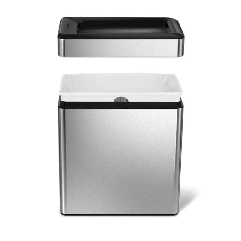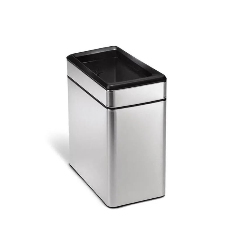 Der rechteckige, offene Abfalleimer von Simplehuman passt mit seiner kompakten Größe und schmaler Form hervorragend in Badezimmer oder Büros. Die Mülltüten können dank abnehmbarem Deckel und herausnehmbaren Inneneimer schnell und unkompliziert gewechselt werden. Die Nachfüllbeutel mit dem Code R passen perfekt in diesen Abfalleimer. Sie sind extra dick und zweifach gesäumt. Kein rutschen, auslaufen oder reißen – und sie bleiben ordentlich unter dem Deckel verborgen. Der Abfalleimer ist 33,1 cm hoch, ist 15,8 cm tief und besteht aus gebürstetem Edelstahl.