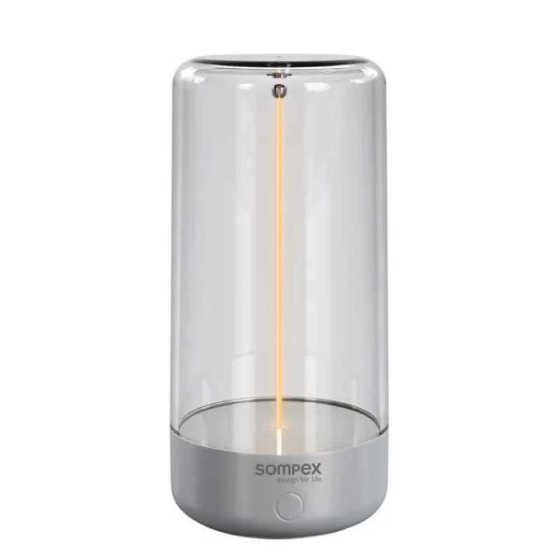 Hier hängt das Licht am seidenen Faden: das LED-Filament der Tischleuchte Pulse von Sompex scheint wie von selbst in der Luft zu schweben. Erst bei genauerer Betrachtung erkennt man, dass die Stahlkugel am Ende des Lichtstrahls durch einen Magneten an der Oberseite der Leuchte gehalten wird. Durch ein leichtes Rütteln kann das Filament gelöst und in der Leuchte bewegt werden, durch Umdrehen der Leuchte wird es wieder fixiert. Dank IP54-spritzwassergeschütztem Gehäuse kann die Leuchte Pulse sowohl im Wohn- als auch im Außenbereich verwendet werden, als stilvolles Wohnaccessoire wirkt sie dabei beisonders als Dekoleuchte auf dem Sideboard oder als Schreibtisch-Accessoire. Pulse besteht aus transparentem Polykabonat und Kunststoff, die Leuchte wird per beiliegendem USB-C-Kabel in 2,5 Stunden aufgeladen. Anschließend kann über den Touc-Sensor an der Vorderseite der Leuchte zwischen drei Lichteinstellungen gewählt werden: 15% Helligkeit (weiches Licht für ein gemütliches Ambiente), 100% Helligkeit sowie dem namensgebenden, pulsierenden Licht-Modus. Die Akku-Tischleuchte Pulse ist 14,5 cm hoch und hat einen Durchmesser von 7 cm.