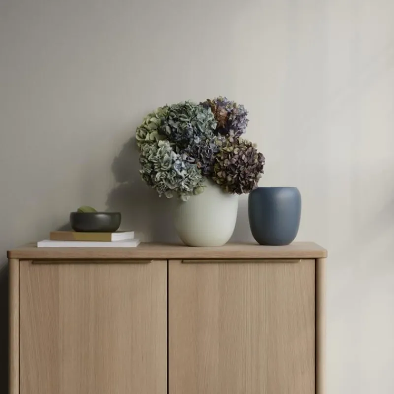Die Serie Ora wurde vom italienischen Designerduo Daniel Debiasi und Federico Sandri entworfen. Die verschieden großen Vasen der Serie sollen nicht nur praktische Begleiter im Alltag, sondern auch skulpturale Designobjekte darstellen, die ein Leben lang begleiten. Gekennzeichnet wird die Serie durch den Kontrast zwischen dem funktionellen Edelstahl und den weichen, organischen Formen der Vasen. Die Außenseite der Ora Vase Klein Mitternachtsblau ist in der Farbe Dusty Blue matt beschichtet, auf der mitternachtsblauen, glänzenden Innenseite entstehen raffinierte Lichtreflexe. Die Vase ist 17 cm hoch und hat einen Durchmesser von 15,6 cm. Sie sollte nur von Hand mit lauwarmen Wasser und einem milden Spülmittel gereinigt werden.
